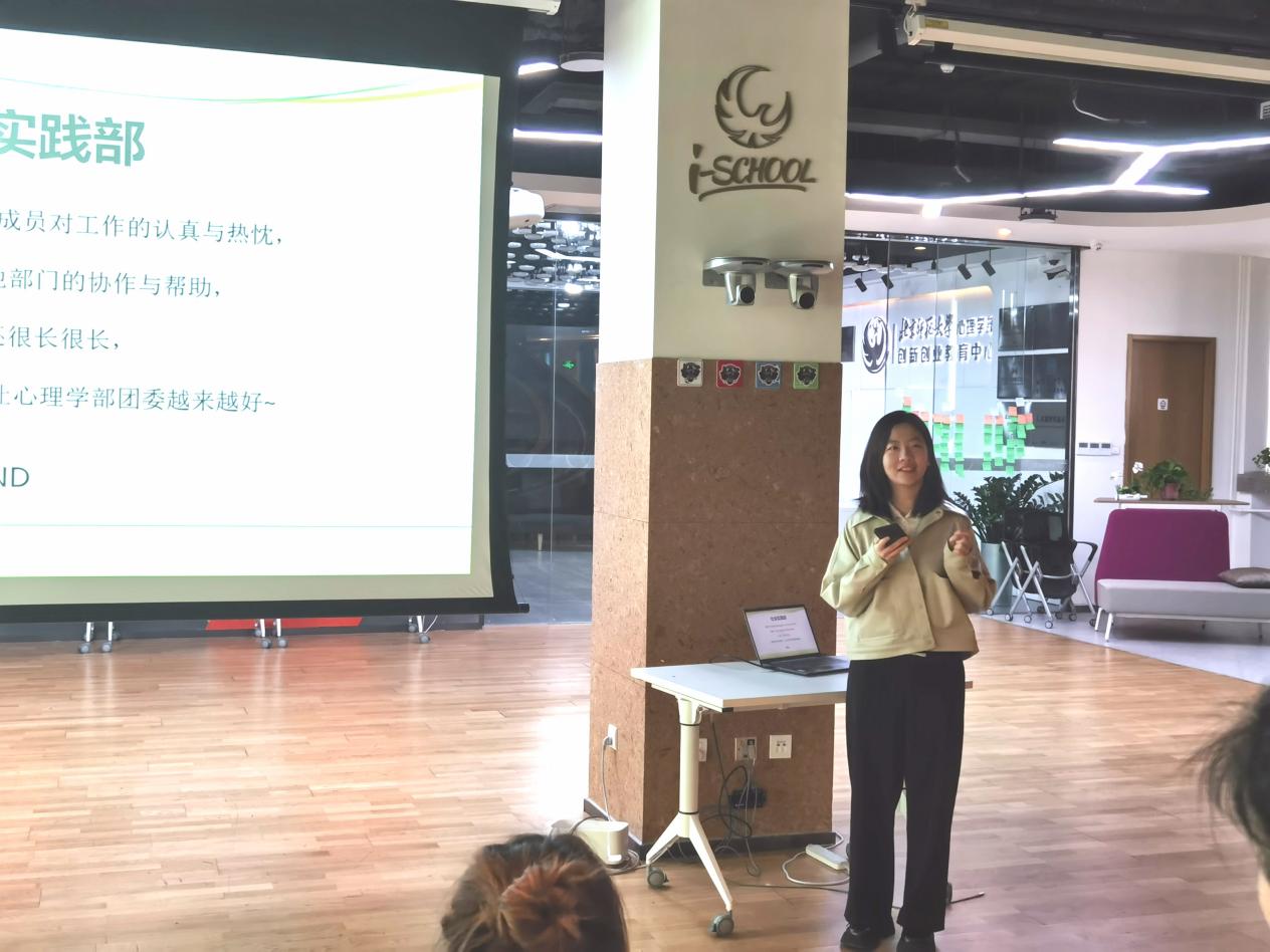 会议开始,全体成员起立,合唱团歌《光荣啊,中国共青团》。随后,各位部长介绍了各部门职责、成员组成、工作具体内容以及工作成果。