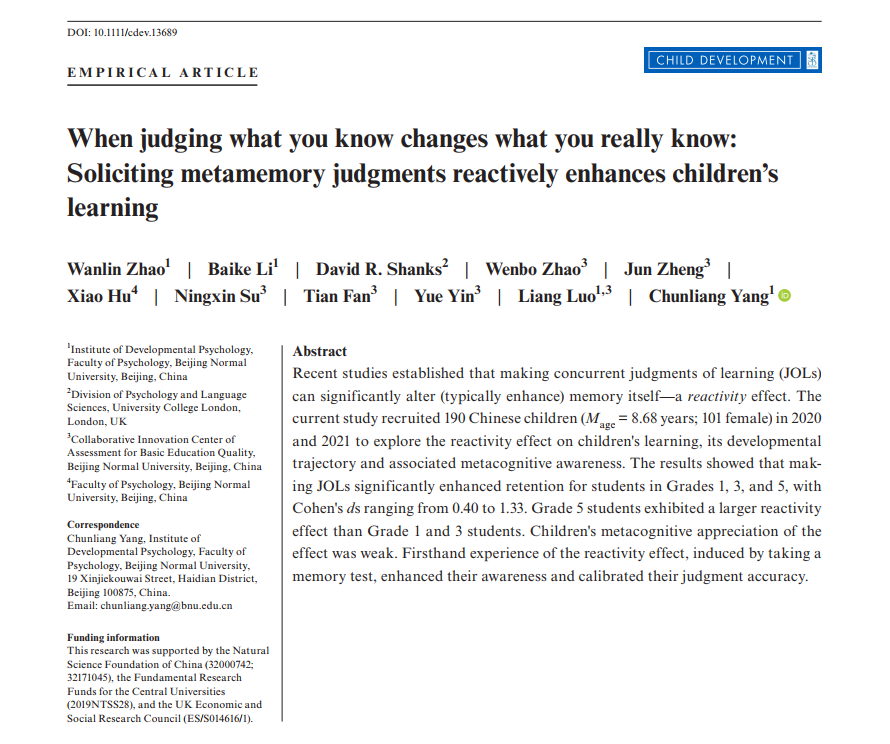 2021年9月17日,污污漫画 -教育部人文社科重点研究基地、发展心理研究院杨春亮副教授和罗良教授在知名心理学期刊Child Development发表了题为When judging what you know changes what you really know: Soliciting metamemory judgments reactively enhances children’s learning的研究论文。该研究首次揭示了学习判断(judgments of learning;JOLs)对儿童学习的反向效应(the reactivity effect),并探讨了反向效应的发展轨迹及其元意识(meta-awareness)。 人们在学习过程中经常会监测自己当下的学习状态,如自我评估“我学会了吗?”,“这门课程期末考试我能考多少分?”,“一周后,我能成功回忆起某个单词的可能性有多大?”。这些自我评估均涉及到对自己所学内容的元认知监测与判断。 在实验室研究中,学习判断是考察元认知监测准确性的一种重要研究方式。学习判断是指在学完一些材料之后,学习者主观预测自己在未来测试中能够记住或成功回忆起这些材料的可能性的一种前瞻性判断。近些年来,一些研究发现,相比于单纯的学习条件(即,相比较于不做学习判断),学完每一个项目之后做一个学习判断能够显著提高人们对所学项目的记忆成绩,该现象被称之为反向效应(即,学习判断反向改变了其判断的对象本身 —— 记忆)。 反向效应表明学习判断可以作为一种学习策略来提高学习成绩。然而,以往研究均以成年人作为研究被试,该效应是否也存在于儿童群体?该效应的发展轨迹如何?儿童是否能够意识到学习判断对记忆成绩的提高作用?如果意识不到,有什么方法可以提高儿童对于这种促进作用的元意识? 为了回答以上关键问题,污污漫画 学习与元认知课题组(课题组网站://metacog.55comics.net/)共招募了190名一年级、三年级及五年级儿童。从小学一年级课本中选取100个汉语双字词作为实验材料。正式实验中,对于一半的词语(即,JOL项目),儿童被试在学习每个词语的同时预测自己在接下来的测试中能够记住该词的可能性,然而对于另一半的词语(即,no-JOL项目),儿童只需要去识记它们,不需要在学习的同时做记忆预测(实验程序见下图)。学习结束之后,要求儿童参加10分钟的拼图游戏。之后,所有儿童被试参加记忆测试。 记忆测试的结果表明,三个年级的儿童被试均表现出对于做学习判断的词汇比不做学习判断的词汇记得更好的现象,即表现出反向效应(见下图a)。更为重要的是,相比较于一年级和三年级儿童,五年级儿童表现出了更大的反向效应,表明反向效应随着年龄而逐渐增加。 此外,该研究还考察了儿童是否认能够意识到学习判断对学习成绩的促进作用。结果发现,在记忆测试前,仅部分学生(约50%)认为学习判断能够提高记忆成绩(见下图c)。然而,在完成记忆测试后,约65%学生能够成功意识到学习判断的促进作用(见下图c)。该结果表明,测试体验能够作为一种有效的干预手段,提高儿童对于反向效应的元意识。 综上,元认知判断作为一种学习策略可以提高儿童的学习成绩和记忆保持。以上结果对揭示学习判断作为一种学习策略能够有效提高儿童的学习成绩以及揭示了儿童反向效应及其元意识的发展模式做出了贡献。同时,该研究也揭示了测试体验对于儿童元意识的矫正作用。 以上研究成果于近期发表于心理学知名期刊Child Development (IF = 5.90)。课题组研究助理赵婉琳和博士生李佰科为本文共同第一作者,通讯作者为杨春亮副教授,其他作者包括北师大发展心理研究院、中国基础教育质量监测协同创新中心罗良教授、伦敦大学学院David R. Shanks教授及课题组其他硕博生。 本研究得到国家自然科学基金(32000742; 32171045)、中央高校基本科研业务费专项资金(2019NTSS28)以及英国ESRC基金(ES/S014616/1)资助,特此表示感谢。 文章链接://srcd.onlinelibrary.wiley.com/doi/abs/10.1111/cdev.13689 课题组网站://metacog.55comics.net/ 参考文献: Yang, C., Yu, R., Hu, X., Luo, L., Huang, T. S. T., & Shanks, D. R. (2021). How to assess the contributions of processing fluency and beliefs to the formation of judgments of learning: Methods and pitfalls. Metacognition and Learning, 16, 319–343. //doi.org/10.1007/s11409-020-09254-4 |