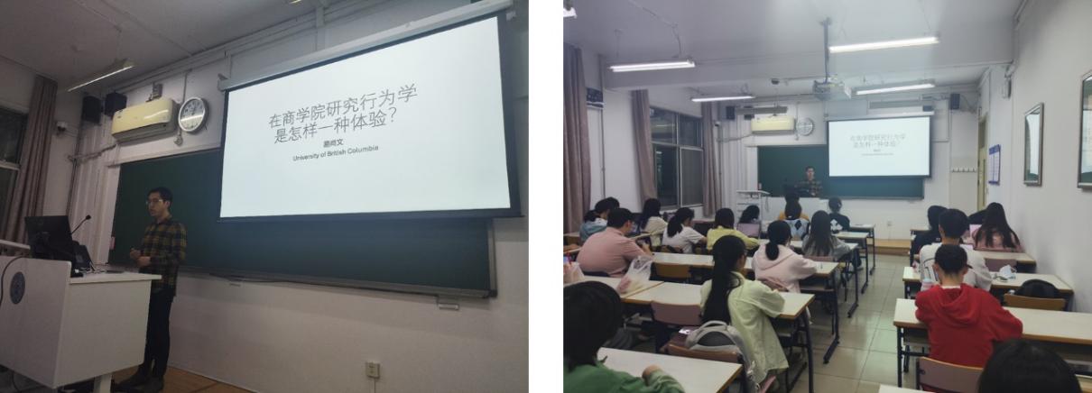 易尚文首先分享了自己在学部的求学经历,介绍了自己走上行为学研究道路的原因,以及参加香港地区高校暑期学校和申请商科行为学博士研究生的过程。随后他讲解了商科中的行为学研究领域和心理学之间的关系,并举出了包括自己的研究成果在内的多个研究实例:如商品标签上写出商品缺点反而会增加购买欲望、通过精心设计的产品参数对比来引导消费者购买特定产品以及不同类型的打折消费券(百分比折扣VS满减)对消费者的消费欲望产生影响等。生动有趣的研究给大家留下了深刻的印象,同学们频繁与主讲人进行积极的互动。在讲座的最后,易尚文介绍了在商科研究行为学的优势,包括自由包容的研究环境、多种研究方法的综合应用与实际生活情境的紧密结合等,并给出了关于心理学专业学生如何增加商科申请的竞争力等建议。在答疑互动环节,胡啸老师一起参与讨论,鼓励同学们打开研究视野,关注包括商科的行为学研究在内的与心理学存在学科交叉的研究方向,找到最适合自己的研究领域。 “心理学能做什么”系列讲座是学部本科生人才培养团队综合方向的特色活动,立足于综合方向“研究+应用”特点,邀请在应用心理学研究和实践领域的杰出工作者开展不定期的主题讨论和交流活动,介绍心理学科研与应用领域的关系,培养学生的科研和实践兴趣,树立“心理学有用”的观念、提升同学们的专业认同感。