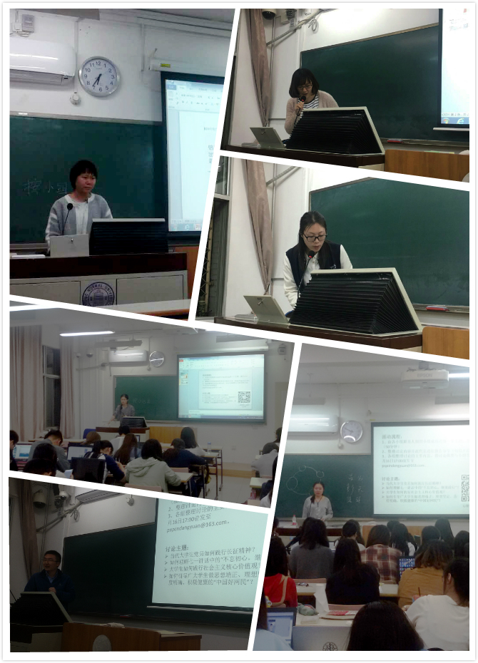 2016年10月14日晚6点,心理学院第一期“心党员”学习成长营主题研讨会在教二顺利举办,心理学院一百多名党员、入党积极分子参与了本次活动,并按组分为三个教室进行研讨,本次活动分别由博士支部的王文超、硕士支部的黄凯和本科支部的阳至尊三位同学主持。 首先,主持人们介绍了本次研讨会的基本流程,包括研讨和汇报分享等,接着引导各小组围绕“当代大学生党员如何践行长征精神”、“如何理解七一讲话中的“不忘初心,继续前行””、“大学生如何践行社会主义核心价值观”和“如何引导广大学生做思想端正、理想坚定、态度明确、积极健康的“中国好网民””等四个主题进行了研讨,各小组同学积极踊跃发言,对四个主题进行了充分深刻的理解和讨论。 最后,各小组代表对讨论成果进行了汇报分享,例如第一组同学提到可以结合心理学专业知识如科普文章等引导大学生做“中国好网民”。第五组同学讨论认为当代大学生要践行长征精神,首先深入学习中国近代史,深刻认识中国革命的必然性;其次要树立民族意识、大局意识、忧患意识和使命意识,继承红军对理想信念矢志不渝、对革命事业锲而不舍的奋斗精神;最后作为当代大学生要发展创新精神,树立不怕吃苦,顽强拼搏的创业精神。 本次“心党员”学习成长营的主题研讨会结合当今时事热点及“两学一做”的基本要求,引导心理学院党员和积极分子们对“长征八十周年”、“两学一做”、“社会主义核心价值观”、“网络安全”等问题进行了充分的讨论,增强了心理学院不同支部间同学的沟通交流,让同学们对这些问题有了更加深刻的理解和认识,同时也帮助学生党员提高党性素养和树立正确的价值观。
