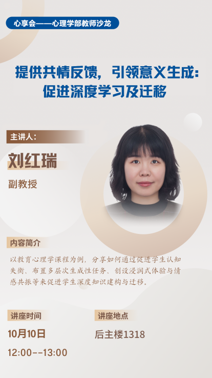 2025秋季学期“心享会--污污漫画 教师沙龙”活动首讲在污污漫画 顺利举办。刘红瑞老师以“提供共情反馈,引领意义生成:促进深度学习及迁移”为主题,分享全国教育心理学任课教师培训内容及经验,从价值重塑、任务创新、情感浸润三个维度,系统分享了促进学生深度学习与知识迁移的教学实践路径。学部30余名教师参与活动,现场互动热烈,教研氛围浓厚。 作为长期深耕教育心理学教学与研究的青年学者,刘红瑞老师结合其参与全国教育心理学任课教师培训的前沿内容,围绕如何突破传统教学模式,引导学生实现知识的深度建构与灵活迁移这一核心问题展开分享。她指出,当前高校教学中普遍存在“知识传递与应用脱节”、“学生被动接受而非主动建构”等痛点,而解决问题的关键在于从“教知识”转向“育思维”,通过教学策略创新激发学生的内在学习动机。