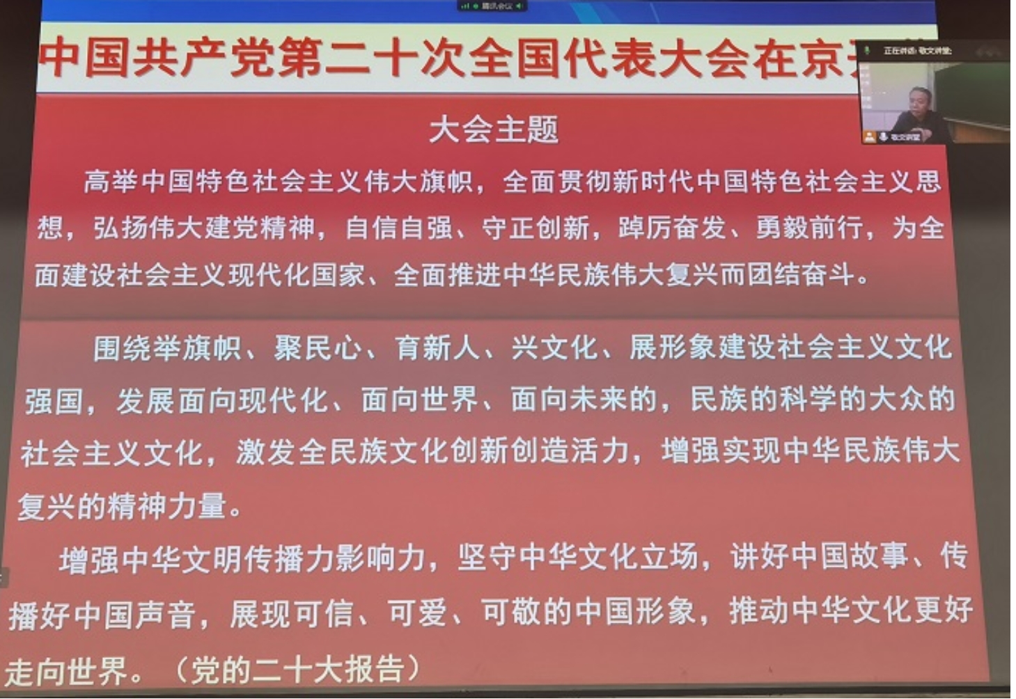 在一片掌声中,课程正式开始。康震老师从党的二十大报告入手,通过讲解其中关于传承创新中华文明的内容,引出课程主题。随后,康老师从“传统文化的思想境界”“传统文化的盛世气象”“传统文化的浪漫情怀”三个方面讲述中国传统文化。康老师的讲课旁征博引,妙趣横生,联系实事,时不时用几句网络热词加以点缀使课堂更加生动有趣。