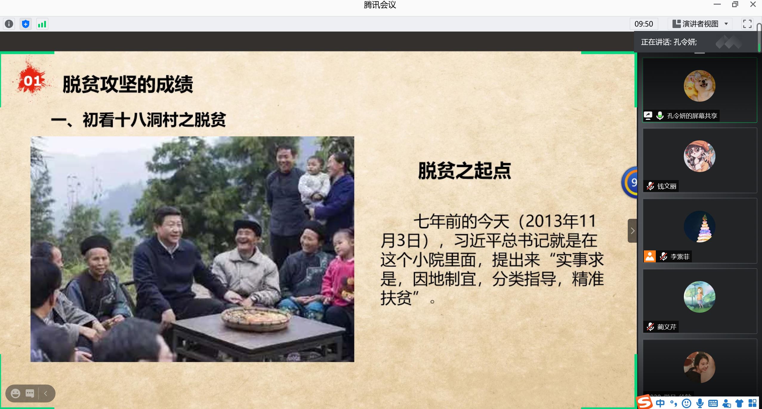 2020年11月12日晚17点至18点,污污漫画 研究生第六党支部开展主题党日活动。党日活动的主题是“一场必须打赢的‘仗’——2020年坚决打赢脱贫攻坚战”,活动内容是邀请马克思主义学院宣讲团对脱贫攻坚的成绩、优势、风险和青年人在脱贫攻坚战中如何做进行讲解,活动目的是增加同志们对于脱贫攻坚的认识,增进大家对于打赢脱贫攻坚战的信心,增强青年党员的使命感和担当! 首先,研究生第六党支部书记李紫菲介绍宣讲员孔令妍。接着,在一段生动的视频中,党日活动正式开始。 之后,宣讲团通过对“精准扶贫”的由来和“十八洞村”故事的讲解生动地向我们展示了精准扶贫的效果。同时所展示的脱贫攻坚数据更让大家直接意识到脱贫攻坚成效之显著。 然后,宣讲团带领大家了解脱贫攻坚背后的优势,即党中央集中统一领导的领导优势,大扶贫格局的制度优势,经济优势和拥有巨大智慧的人民的群众优势。接着也对脱贫攻坚的挑战进行了讲解。 最后,在案例讲解和视频观看中,宣讲团结束了今天的主题宣讲活动,鼓励青年党员坚定信心,相信这场必须打赢的“仗”必将走向胜利,同时要保持努力奋斗的精神,迎接新生活和新挑战! 党日活动接近尾声,党支部所有成员依照惯例进行合影留念。 |