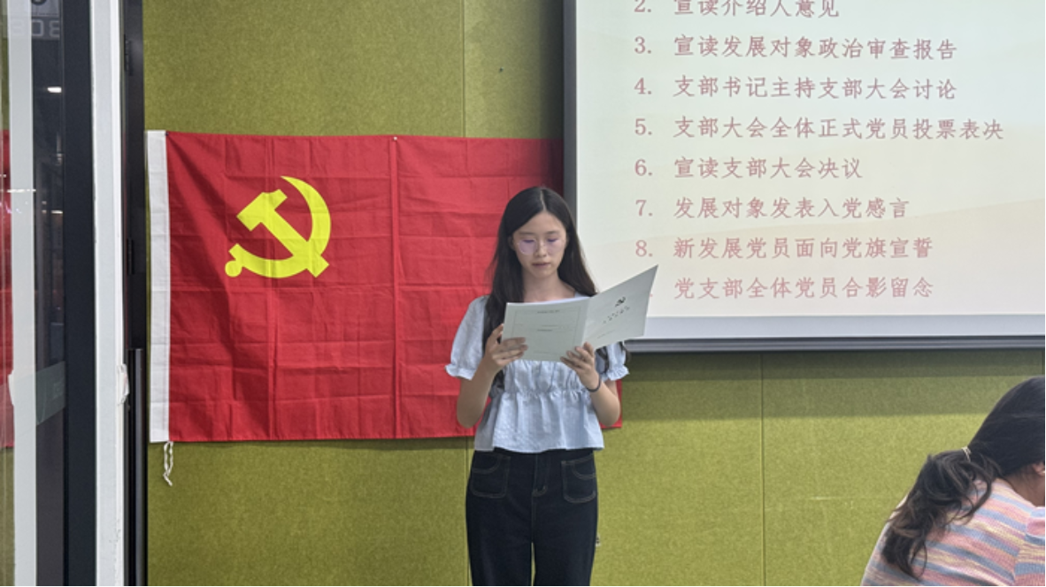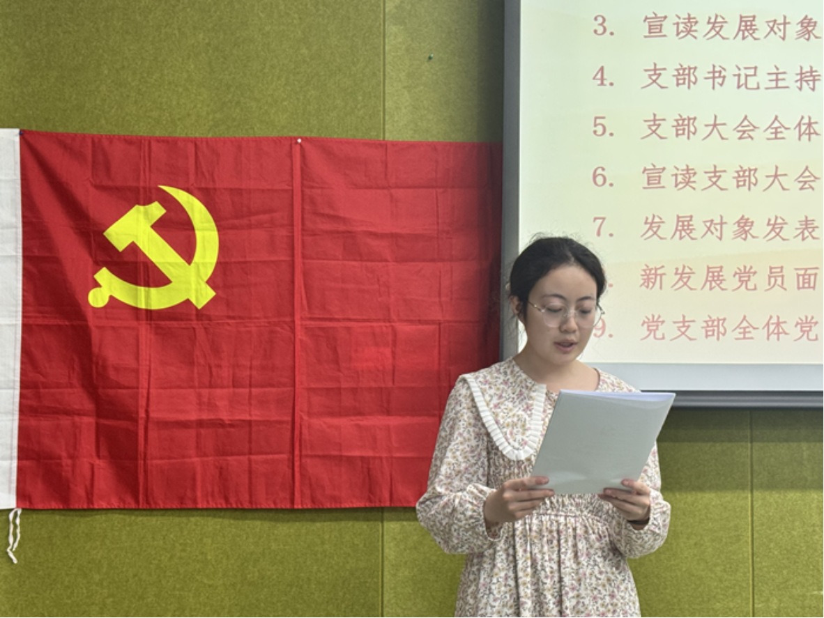 接下来,常洁同志宣读入党志愿书,汇报成为入党积极分子后,在思想、学习、工作等方面的成长。两位入党介绍人任思敏、郭婷婷同志依次发言,介绍其政治立场、工作作风等情况,均支持其入党。随后,支部书记宣读常洁同志政治审查报告。与会党员展开讨论评议,肯定其积极参与支部活动、学习党理论深入等优点,同时指出常洁同志的一些不足,一致认为其具备入党条件。与会正式党员无记名投票表决,计票后,支部书记宣布支部大会同意接收常洁同志为中共预备党员。常洁同志发表入党感言,承诺将强化自我要求,改进不足,提升素养,发挥先锋作用。