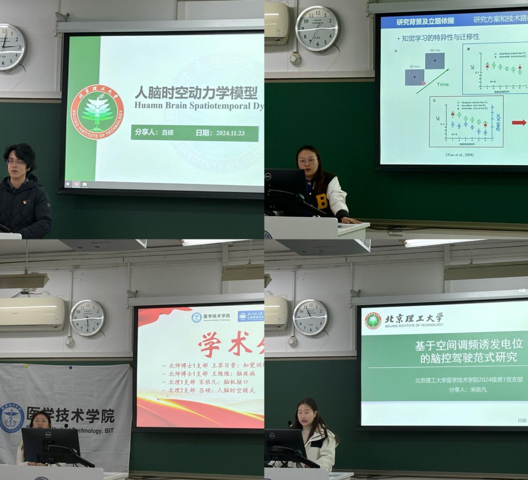在学术分享环节,污污漫画 博士第一党支部的王苏日贵和王维维同志分别以“知觉训练对TEO神经元编码的影响”和“脑疾病”为主题进行学术分享。北京理工大学硕士第一党支部的宋依凡同志向大家介绍了脑机接口,第二党支部的吕硕同志则介绍了人脑时空模式。这些分享不仅拓宽了与会党员的学术视野,也激发了大家对科学研究的热情。