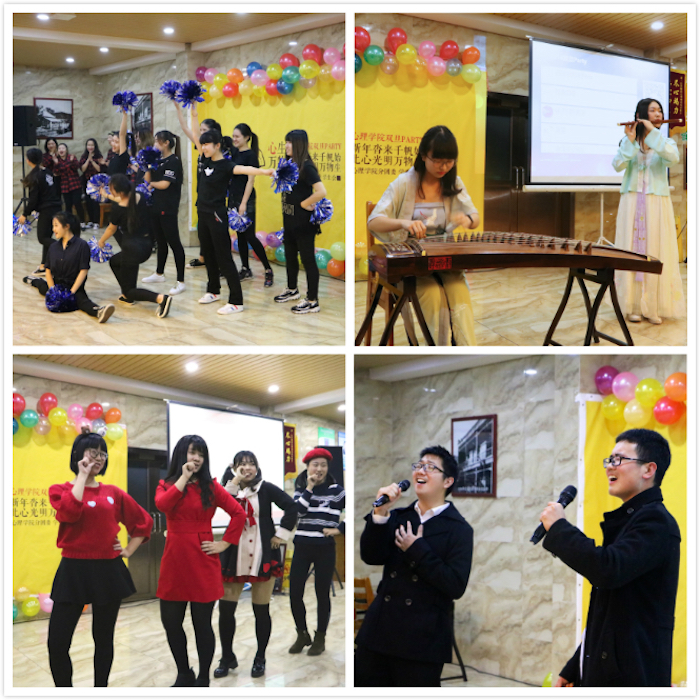 2016年12月17日晚8点,心理学院“双旦”饺子晚会在西北餐厅二楼成功举办,同学们感受到了热闹的节日气氛和似家的温馨。16级新生班主任张照鹏老师也来到现场,与同学们一起度过这个美好的夜晚。 晚会上,心理学院的同学们呈现了精彩绝伦的节目。舞蹈有啦啦操、街舞、流行舞、现代舞,火热的舞蹈直接点燃了现场的气氛;魔术社社长陈俊龙的魔术表演也十分抓人眼球;歌曲有《贝加尔湖畔》、《一生有你》,还有笛筝合奏《春到湘江》,深情的演唱和纯净的音乐,让人的灵魂都安静了下来,捕获了许多同学的心。现场掌声雷动,欢呼不断。 同学们包的饺子五花八门,经大众评选,评出了“最美饺子”和“最奇葩饺子”。饺子出锅之后,同学们边吃边听相声,笑果极佳。晚会上,还放映了来自家长们的新年祝福,给同学们带来了惊喜。 晚会持续了两个多小时,最终在一片欢乐的气氛中结束。“心生万物”双旦晚会顺利落下帷幕,2016年也在我们奔忙的脚步声中渐行渐远。展望2017,愿我们心中梦想的火苗燃成绚烂的烟火,奋力前行!