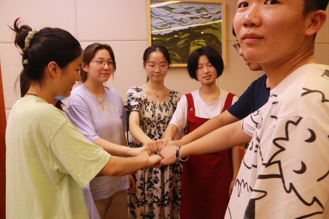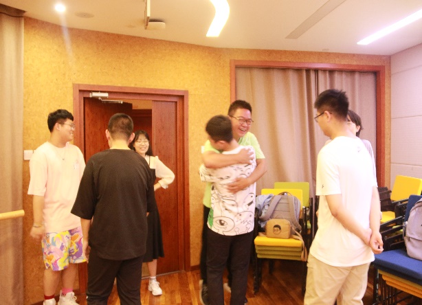 在活动的最后,小组内成员之间手握大拇指,形成一个漂亮的同心圆,并相互鼓舞,热情地喊出“有你真好,与你同行”的口号,整个游戏在一片欢声笑语中落下帷幕。 在分享自己参与本次活动的感受时,同学们给出的形容词有愉快、开心、温暖、热情等等,黄老师组织同学们一起为自己加油打气,并给予了大家真挚美好的祝福。