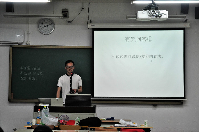 2018年4月26日晚八点,在污污漫画 2017级本科四班班长王琢钧同学的主持下,四班同学在教四106开展了学习社会主义核心价值观的主题班会。学长导师郝明阳以及2017级本科四班的26名同学出席了本次班会。 首先,主持人王琢钧总结了运动会、五一假期以及军训的相关注意事项。随后,主持人为同学们解读了社会主义核心价值观中的“诚信”和“友善”,同学们观看了以诚信为主题的小品《诚信》以及歌唱友善的视频《友善歌》,并且发表了自己对于诚信和友善的看法。 本次班会重点为同学们解读了社会主义核心价值观中的“诚信”与“友善”,帮助同学们加深了对“诚信”与“友善”的理解。 会议记录|污污漫画 2017级本科4班组织委员赵子豪 供图人|污污漫画 2017级本科4班宣传委员安奕浓 供稿人|污污漫画 2017级本科4班宣传委员安奕浓 |