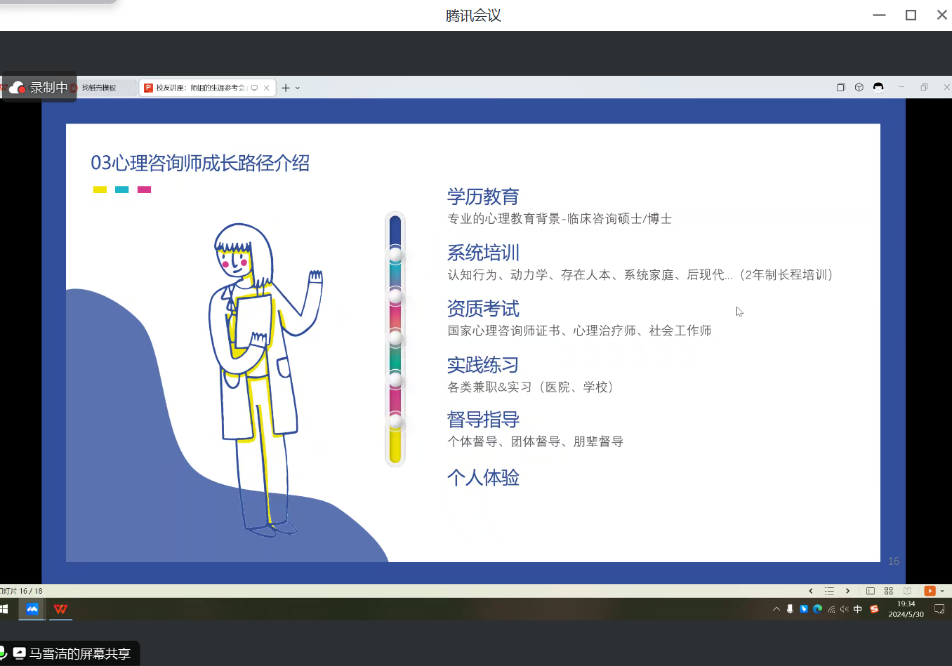5月30日下午18:30于腾讯会议,学部校友会邀请到2011级本科生校友马雪洁作为校友导师,围绕心理咨询行业现状,分享五份心理咨询方向工作经验,并为同学们介绍心理咨询师成长路径主题,以小范围讲座的形式,开展了本学期的第三场校友导师行业分享系列讲座,二百一十余位学部本硕博同学参加了本场分享。