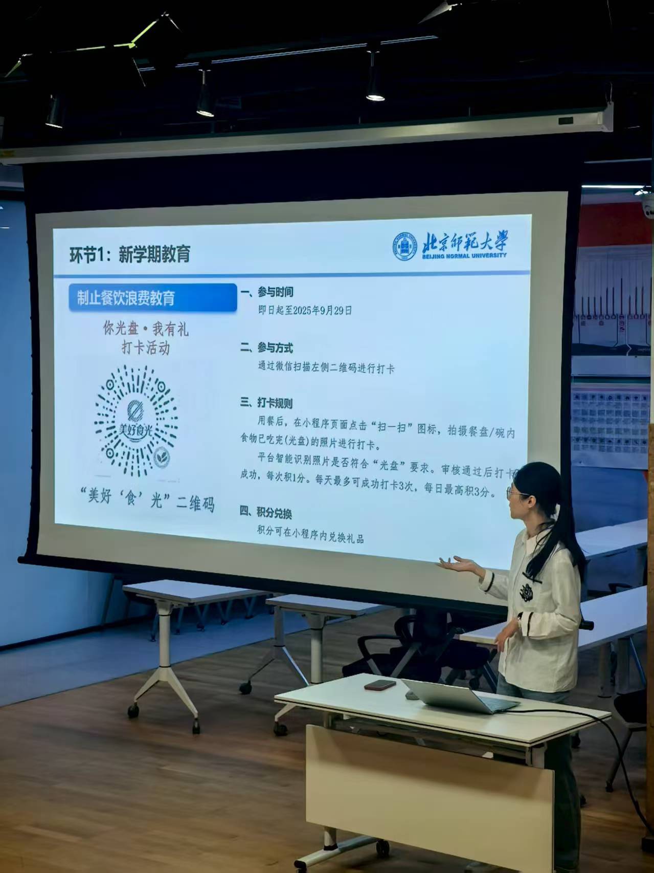 随后,班长窦佳宁主持开展了第一次主题班会,通过精心准备的PPT内容,从安全教育、抗战主题教育、制止餐饮浪费、学生发展支持等多个方面展开讲解。在安全教育部分,内容涵盖宿舍安全、消防安全、网络安全、交通安全与国家安全,通过案例分析与实用提醒增强同学们的安全意识。同时也通过抗战主题教育环节引导同学们传承红色基因、坚定理想信念。在制止餐饮浪费部分,班会介绍了学校“你光盘·我有礼”打卡与创意作品征集活动,倡导勤俭节约、珍惜粮食的良好风尚。学生发展支持环节详细介绍了学校在就业指导、资助管理、心理健康、学业辅导等方面的资源与服务,帮助同学们更好地规划学业与生活,全面提升综合素养。