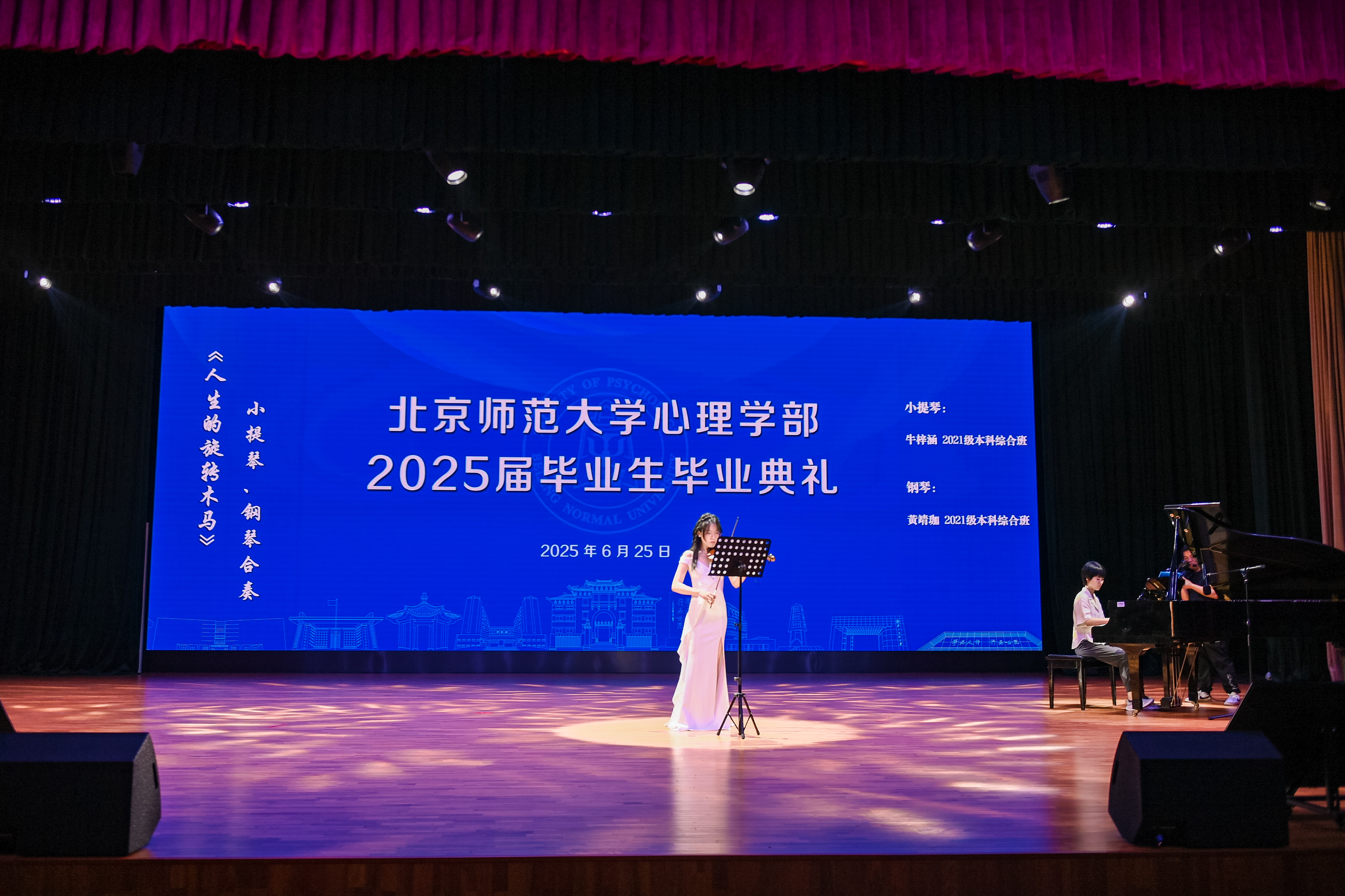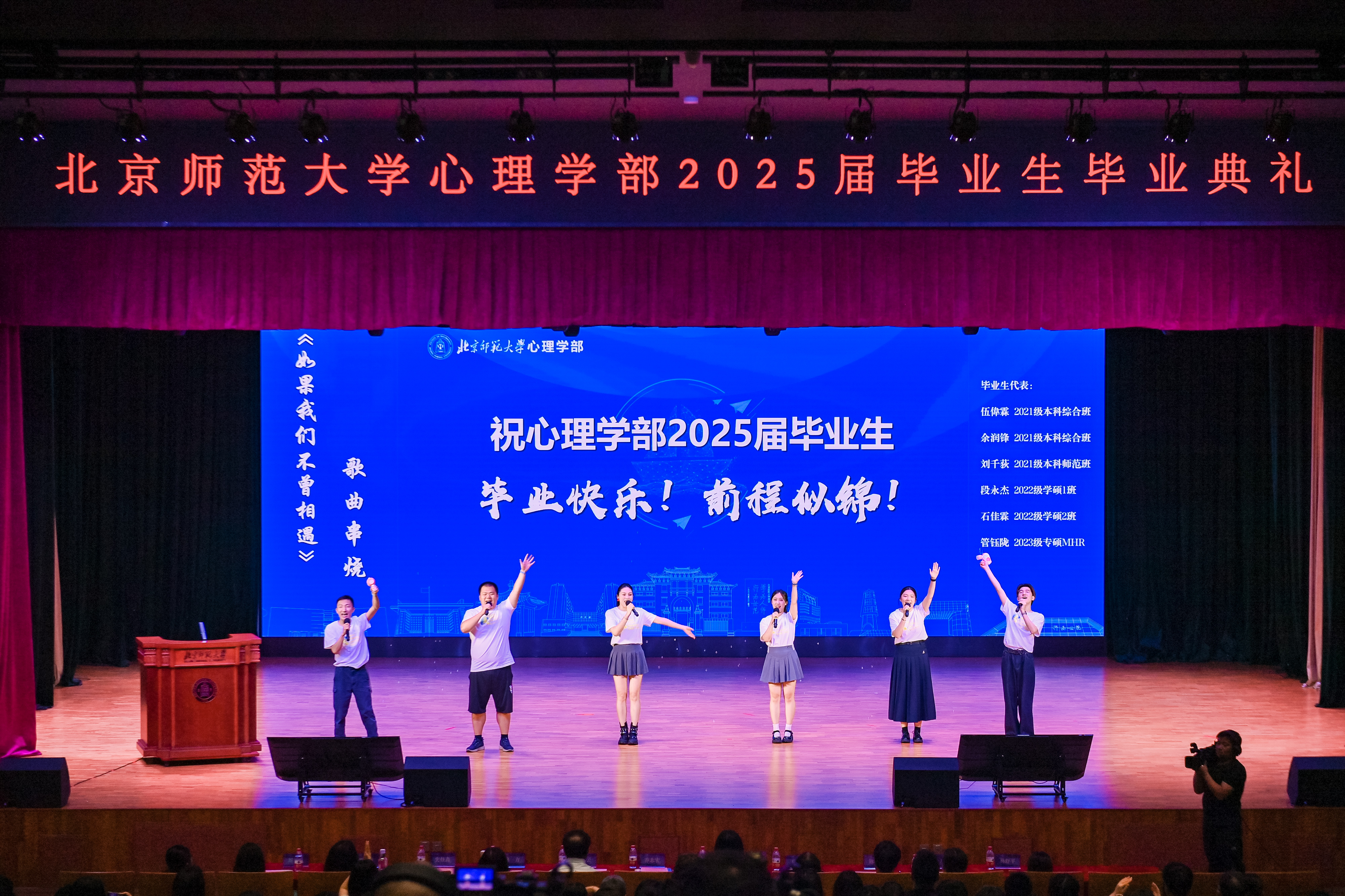 典礼上播放了由本科、专硕、及学术硕博毕业班精心制作的纪念视频,生动再现了毕业生们从青涩入学到自信毕业的珍贵历程,这些定格瞬间或精彩、或感伤、或幽默、或激昂,无不承载着同窗情谊与青春印记,成为镌刻在每位毕业生心中的难忘回忆。2025届毕业生代表——本科生唐凤华、MHR方向专业硕士张鹤至、博士黄顺森依次登台,深情讲述了自己在学部求学、生活、科研和生涯发展的精彩故事,用亲身经历诠释了心理学学习赋予他们的蜕变与成长。