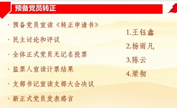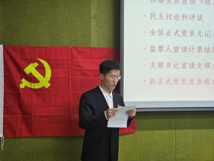 首先,王钰鑫同志宣读了自己的转正申请书,并向党组织汇报了其成为预备党员一年来的思想、学习、工作等情况。支部大会对王钰鑫同志的情况进行了热烈讨论,一致认为王钰鑫同志具备了一名共产党员的条件。支部大会全体正式党员同志进行无记名投票表决,同意王钰鑫同志按期转正。王钰鑫同志发表了转正感言,承诺自己一定持续严格按照党章党规严格要求自己,为建立中国特色社会主义伟大强国作出贡献。