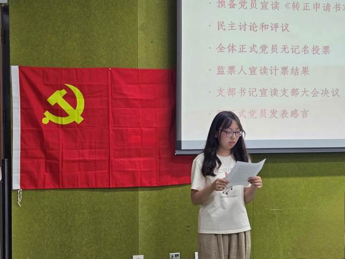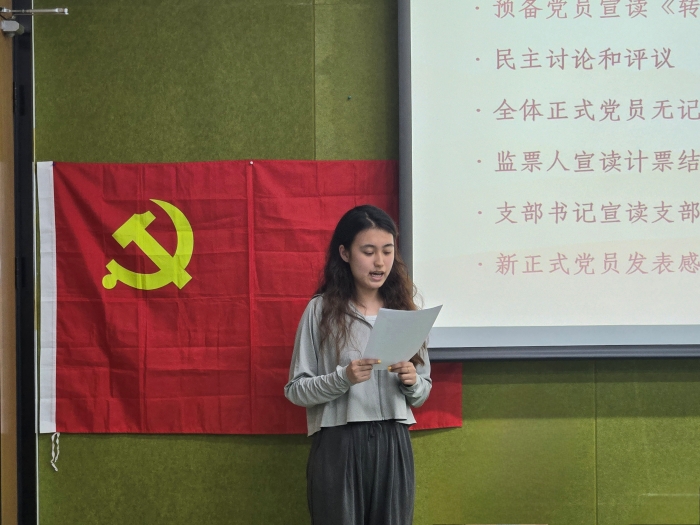 随后,陈云同志宣读了自己的转正申请书,向党组织作了其近一年来思想、学习、工作等情况的汇报。支部书记杨媛同志认为其班级学习委员、支部党小组长等各项工作都反映出其积极服务同学,践行了人民至上的理念。经过民主讨论和评议,支部大会全体正式党员同志进行无记名投票表决,同意陈云同志按期转正。陈云同志发表了转正感言,表示将永远铭记面向党旗宣誓时的心潮澎湃,把入党誓词转化为每一次的实际行动。
