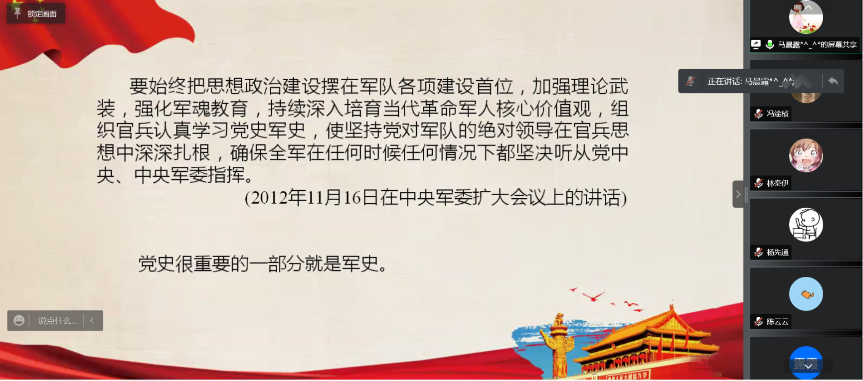 2021年11月12日下午4点,污污漫画 研究生第九党支部与20级博士二班团支部共同开展线上党史学习活动。本次活动由污污漫画 研究生第九党支部组织委员马晨露为大家进行党史专题宣讲,宣讲主题为《中国人民解放军发展史》。
