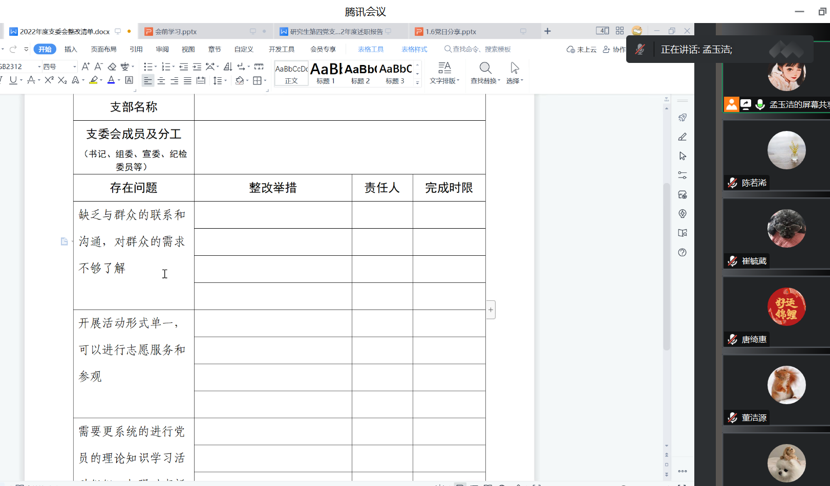 2023年3月8日8点30分,污污漫画 研究生第四党支部成功召开2022年度党支部组织生活会和党员民主评议,会议通过“腾讯会议”线上开展。本次会议由党支部书记孟玉洁同志主持,共11名同志参与,内容主要分为三个部分:会前集中学习材料,开展批评和自我批评与支部评议,进行民主测评。
