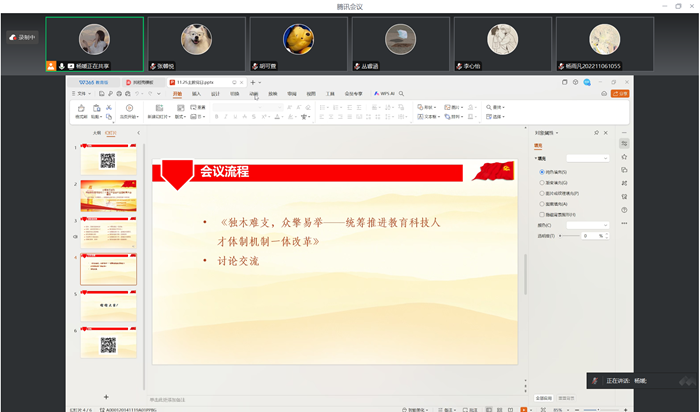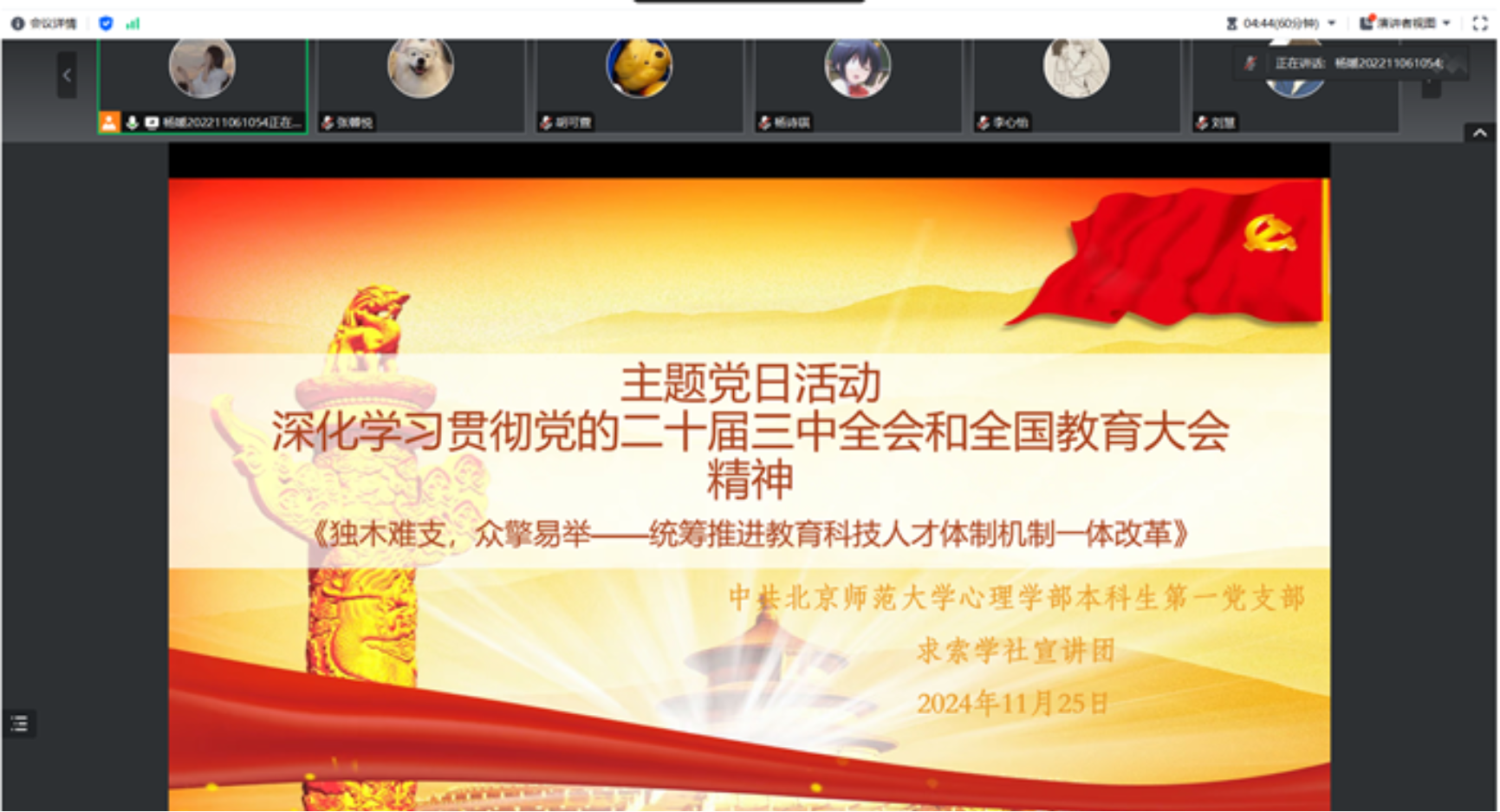 2024年11月20日20时,污污漫画 本科生第一党支部顺利开展11月份主题党日活动。本次活动邀请了污污漫画 求索学社宣讲团的金敏同志进行以《独木难支,众擎易举——统筹推进教育科技人才体制机制一体改革》为题的宣讲,通过“腾讯会议”平台以线上会议的形式进行,由杨媛同志主持,共49名同志参与。