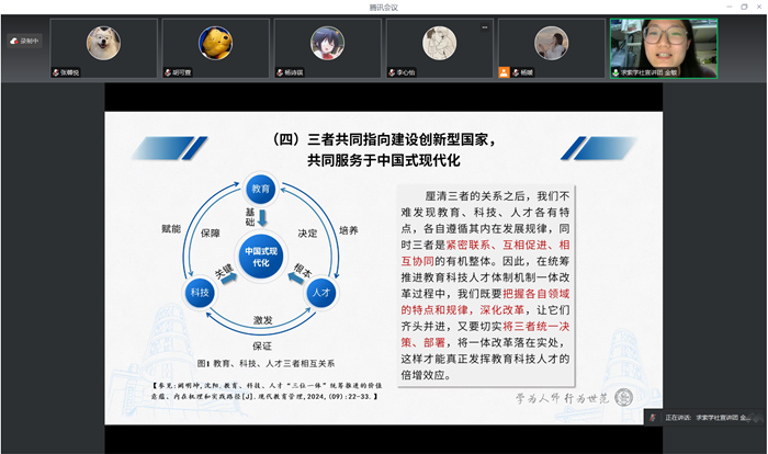 然后,求索学社宣讲团的金敏同志阐述了教育、科技、人才的相互关系,三者共同指向建设创新型国家,共同服务于中国式现代化。金敏同志还通过低空经济的生动例子,呈现了中国式现代化持续推进的缩影。只有深刻把握教育、科技、人才之间的内在联系,紧扣三大领域一体改革,才能更好地推进中国式现代化建设,不负党和人民的期待。