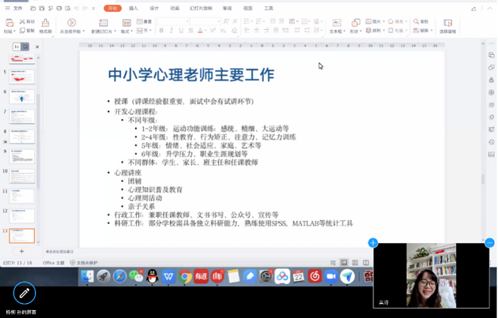 2020年4月22日,污污漫画 2020届临床与咨询方向专硕毕业生面试分享会在ZOOM会议室召开,本次分享会由学工办孙杨柳老师和临床与咨询方向班主任赫嘉番老师主持,分享会聚焦于高校心理咨询中心和中小学心理教师行业。来自高校心理咨询中心、中小学教育行业的六位老师受邀出席了会议:河南省巩义市第二高级中学书记、校长王秋萍老师,中央财经大学学生心理咨询中心副主任赵会春老师,某中学专职心理教师吴诗老师,高校心理中心专职心理教师张达老师,污污漫画 心理健康服务中心全职心理咨询师毕文秀老师和陈沛昱老师。 赵会春老师和张达老师对高校心理咨询中心的行业现状、招聘要求及个人发展进行了详细的介绍。 在不同高校,心理咨询中心的岗位编制不同,这影响到未来的工作晋升制度,两位老师建议同学们在求职时应提前了解。高校心理咨询中心工作压力很大,不仅负责咨询工作,还需要进行管理、危机普查、危机干预等工作,对于名校来说,危机干预更是重中之重。除学历等硬性规定之外,高校心理咨询中心的招聘要求还有:专业能力过硬、有一定的人机沟通和管理能力,最重要的,是有咨询师的感觉。 在招聘时,一般分为笔试+面试,笔试注重专业知识的考察,包括对心理咨询的了解、个案概念化、学校危机干预、常见精神疾病了解和评估等;面试则根据学校的不同会略有差异,可能会有模拟咨询、三人小组模拟咨询和试讲等几种方式。 对于有志从事进入高校心理咨询中心的同学,老师表示,在高校心理咨询中心工作的人,需要耐受压力和清贫,希望同学们综合考虑自己的职业生涯规划和职业期待、个人追求和家庭期待。 对于中小学心理教师行业,王秋萍老师、吴诗老师先后做了介绍。王秋萍老师表示,河南省巩义市在招聘教师时,会由教育局、人社局等组成招聘组,在政府官网发布招聘启事,然后将入选的教师分配给申请的学校。由于心理健康教育属于冷门专业,因此本科学历也有可能接受。该校对于心理健康教育很重视,专职心理教师主要负责新生普查、心理健康小报、高一的心理课、个案辅导和团体辅导、针对特殊群体的讲座等工作。在不同学校,心理老师的晋升通道会有区别。王老师鼓励同学们注重工作的稳定性,扎根一个领域,为基础教育做出自己的贡献。 吴诗老师是一线的心理教师,她结合自己的亲身经历也做了相应介绍。吴老师主要负责心理辅导、心理健康活动、课程建设和普查等,学校也鼓励心理老师进行科研活动。作为心理老师,需要经常和班主任、其他教师、学生和家长们沟通,因此人际沟通能力很重要、待人热情、谈吐自信很重要。每个学校对于心理老师的定位不同,面试时考察的侧重点也不同,吴老师建议同学们在求职时要了解清楚该校的心理教师定位和环境建设等方面。如果同学们前往非京地区求职,会有很大优势。 毕文秀老师也对心理健康服务中心的专职咨询师工作进行了扼要介绍。毕老师介绍,心理健康服务中心面向全社会,因此来访者相较于高校心理咨询中心,会更加多元。专职咨询师主要从事的工作有:专业工作,包括个体与团体咨询、接受督导与提供督导(35-40%);参与项目(30-35%);举办工作坊、培训、公益讲座和从事科研活动(10%);写作科普文章(5%);事务性工作(20-25%)。在面试时,注重求职者的个案分析能力、临场发挥能力、对理论和伦理的把握程度、职业规划和危机干预能力。 在各位老师介绍完毕后,同学们基于自身需求,提出了疑问,老师们一一解答。历时1小时40分钟,本次面试分享会圆满结束。 编辑丨张维念 |