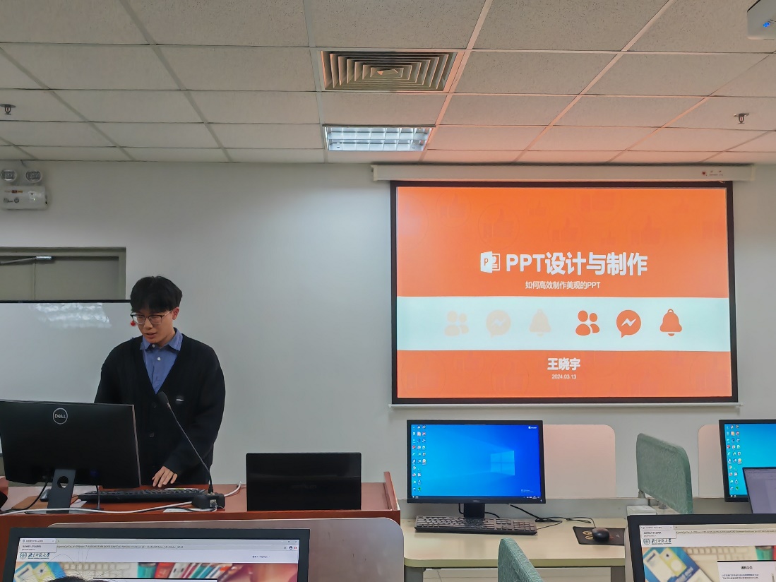 王晓宇老师从“PPT制作思路、PPT设计原则、PPT制作技巧、AI制作工具介绍、相关资源推荐”六个部分展开,详尽地介绍了PPT设计与制作的经验秘籍。王老师的讲解深入浅出,理论与实际操作紧密结合,讲授内容与研究生阶段的科学研究、学术汇报联系紧密。 参加讲座的同志们表现出极高的学习热情,在讲座过程中,同志们积极与王老师互动,并在PPT设计与制作的实操环节提出了自己的疑问,王老师也都一一耐心解答,帮助同志们将理论应用到实践中。