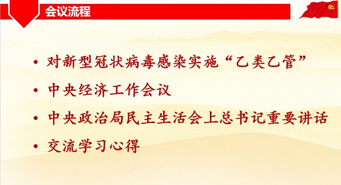 2022年12月30日晚20:00,污污漫画 本科生第二党支部第一、二、四小组顺利召开党小组会。会议通过“腾讯会议”平台线上举行,由第一小组组长付晨露同志主持,共31名成员参与。会议的主要内容为学习《关于对新型冠状病毒感染实施“乙类乙管”的总体方案》、观看2022年12月16日中央经济工作会议、学习2022年12月27日中央政治局民主生活会上总书记的重要讲话并思考讨论。 首先,全体起立,奏唱《国际歌》。