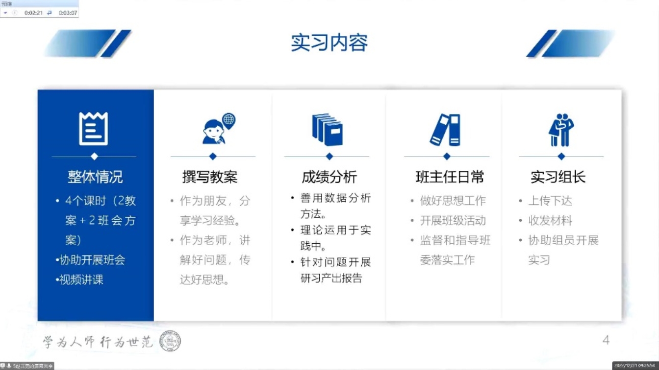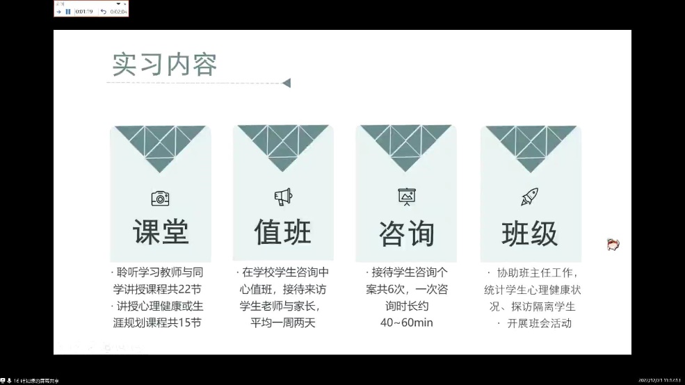 2022年12月31日上午,污污漫画 教育实习总结汇报大会顺利举办。本次活动由负责本科师范班见习实习的陈师韬老师主持,同时邀请了本科师范班团队负责人刘霞老师、骨干刘艳老师以及本次教育实习指导老师之一王孟元老师为同学们提供反馈和指导。在本次参与教育实习的35位同学中,共有18位同学通过汇报展示的方式进行了教师职业能力测试面试及各类评优展示。本次汇报大会也吸引了近70名大一至大三同学线上参会,以学习了解中学心理健康教师教育实习情况。 汇报正式开始前,主持人陈师韬老师介绍了本次总结汇报大会的目的、具体要求及各位参会老师。随后,18位同学按照预先分成的三人一组,按顺序进行了五分钟的汇报,随后由参会老师进行点评交流。本次汇报主要涵盖了同学们各自的实习概况、实习内容和主要收获三部分。由于今年不同地区的疫情形势不同,同学们遵循各地及学校的防疫政策分别进行了线上、线下或线上线下相结合的教育实习。实习方式的不同为同学们带来了形式多样的实习内容。但无论形式如何,同学们都在带队老师及实习基地指导老师的引导和帮助下积极完成了实习工作,并获得了丰富的收获。汇报过程中,参会老师积极与同学们进行互动,根据汇报内容提出相关问题,并进行整体的点评和反馈。 通过本次总结汇报大会,同学们对自己的教育实习工作进行了深入总结与反思,在教育实习实践基础上得到进一步学习与提升。同时,通过观摩学习大四年级的教育实习总结与反思,大一至大三各年级同学对教育实习工作也有了进一步认识和了解,不仅激发了同学们对心理学专业知识学习的动机,也增强了对中小学心理健康教师职业的认同。本次教育实习总结汇报大会取得圆满成功!