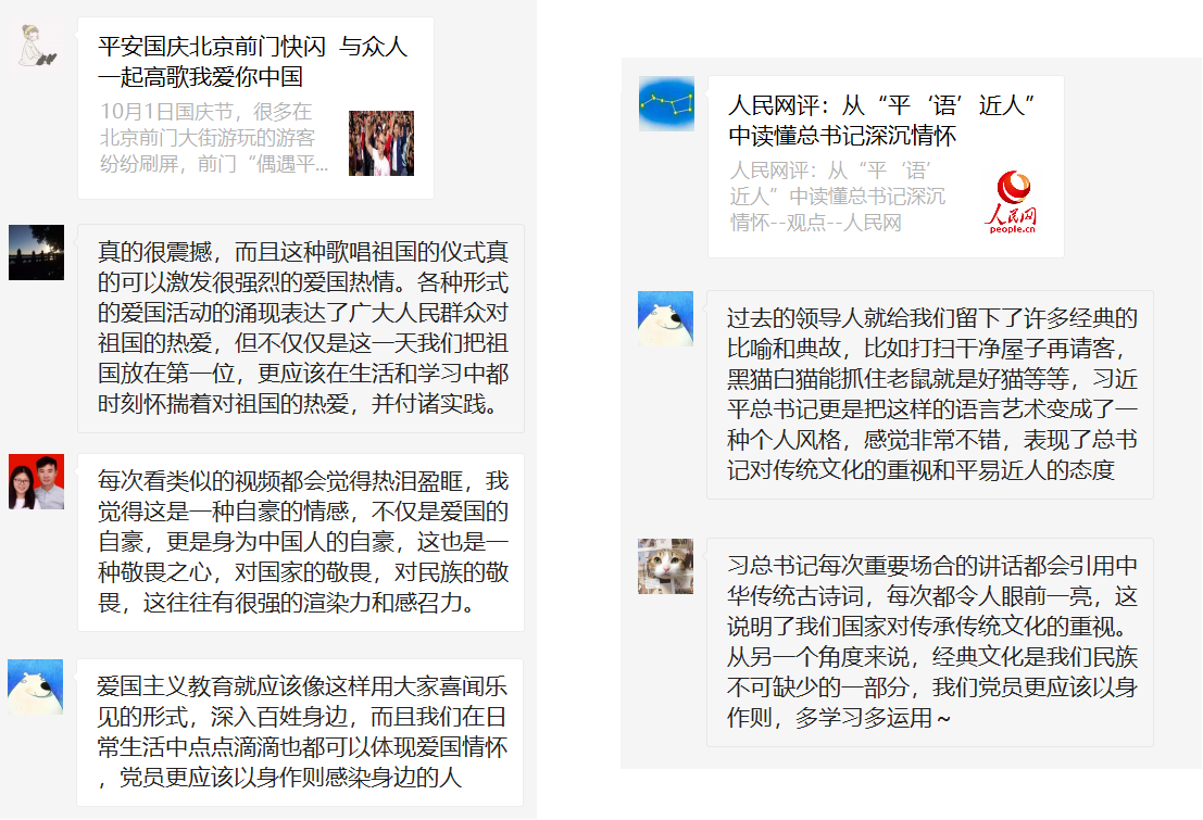 2018年10月10日晚,污污漫画 研究生第六党支部开展了10月固定党日线上分享活动。积极分子魏铭及陈俊霖结合最近的时事新闻分享了污污漫画相关的文章与个人心得,支部其他成员也积极参与讨论,纷纷发表了自己的看法。 国庆长假刚结束不久,魏铭同学关注到了国庆节当天几名央视主持人以及歌手平安在北京前门“快闪”演唱《我爱你中国》的表演视频,表演期间围观的游客也参与了合唱,营造了千人合唱的壮观场景。她表示,这种轰动性的场面让并未身在其中,仅作为观看者的自己也着实感到十分振奋,并表示要坚定信念,怀着崇高的理想,以不懈奋斗挥洒出对祖国的热爱,为早日实现中国梦贡献一份力量。支部其他成员在看过视频以后一方面表示很受震撼与鼓舞,激动与自豪感溢于言表,另一方面也对这种表达爱国之情的活动形式表示欣赏。李昌锦同学表示用这种形式进行爱国主义教育很容易深入百姓身边,同时也感悟爱国情怀可以被体现在日常生活的点点滴滴中,党员同志更应该以身作则感染身边的人。 在后半程的分享活动中,陈俊霖同学向大家推荐了央视最新推出的“平语近人”百家讲坛系列节目。他讲到,央视制作的这一系列短片一方面能让大家更深入准确地理解总书记讲话的思想,让高大上的讲话更接地气、深入人心;另一方面通过总结这些“点睛之笔”,也有助于将发扬我们的传统文化和文化自信落到实处,而央视作为宣传战线的排头兵,文化节目的改革也是正当其时。支书杨颖表示也曾从其他渠道得到过对这一节目的推荐,并表示可以在今后的支部活动中组织同学们一起观看学习。王玉洁同学也分享了一个有趣的观点,她认为政治口号在一定程度上可以被理解为是一种“号子”,简洁但却富于力量和引导性。支部内的其他成员表示道,习总书记的这种语言风格反映了他对传统文化的重视,作为党员,我们也应该多学习多运用经典文化,这也可以帮助我们更好地学习理解政治思想。 本次分享会进一步激发了支部同学们的爱国热情与民族文化自豪感,也鞭策着大家怀揣对祖国的热爱不断奋进前行。 (研究生第六党支部 赵宸供图供稿) |