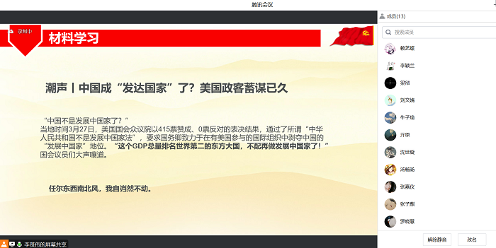 本科生第一党支部第二党小组顺利召开4月份的党小组会。会议通过“腾讯会议”平台以线上会议的形式进行,由李贳伟同志主持,共13名成员参与。本次会议的主要内容是学习习近平总书记在“学习贯彻习近平新时代中国特色社会主义思想主题教育工作会议”中的讲话、《聚焦两会丨听,来自北师大校友的声音》、《潮声丨中国成“发达国家”了?美国政客蓄谋已久》这三则材料。 首先,李贳伟同志带领全体成员奏唱国际歌。 随后,李贳伟同志带领大家对习近平总书记在主题教育工作会议中发表的重要讲话进行学习。该视频材料共十五分钟左右,通过新闻播报的方式阐述了这次主题教育工作会议中总结的重要发展目标,并聚焦于习近平总书记重要讲话中的精华内容。