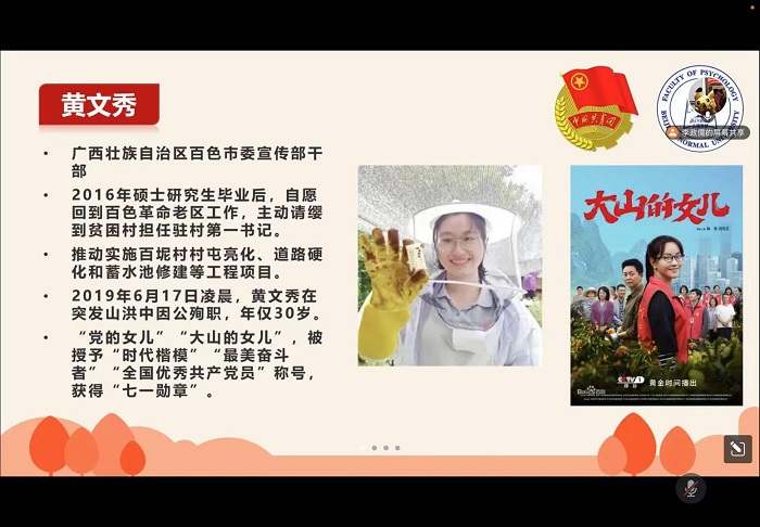 图 1活动开始 紧接着,李政儒向学员们介绍扶贫主题电视剧:《大山的女儿》。这是一部讲述黄文秀在研究生毕业后,放弃了到大城市工作的机会,毅然回到家乡,奋战在脱贫攻坚一线的故事片。本次观影既是一个了解北师大学子优秀事迹的机会,又是一个感受党为人民无私奉献谋幸福的过程。