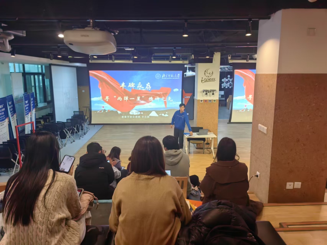 然后,团支书邀请到了求索学社宣讲团的同学为班级团员进行主题团日宣讲,为大家带来了“丰碑永存,追寻‘两弹一星’精神之光‘”的宣讲活动,让同学们深刻地理解两弹一星的伟大精神。