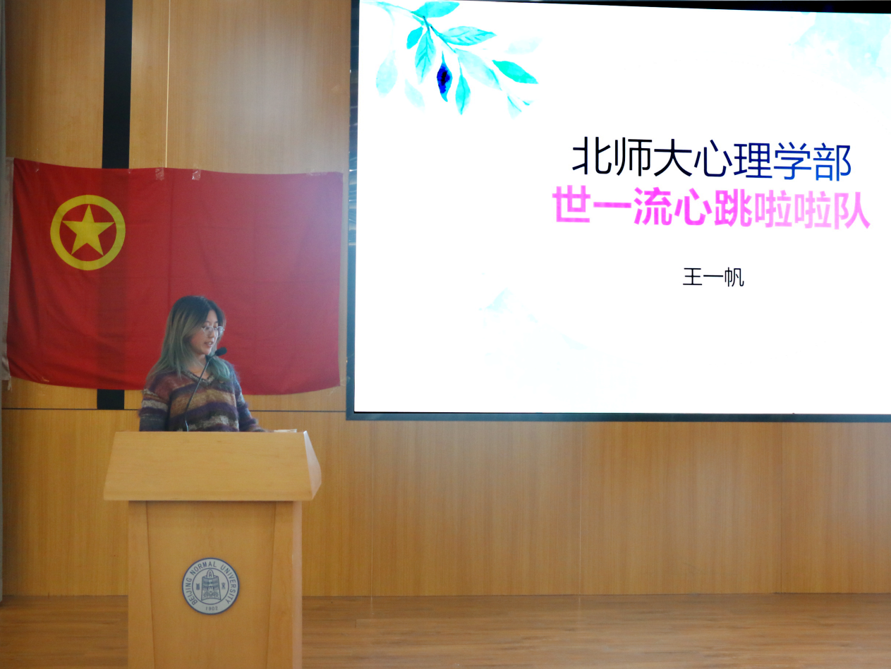 报告结束后由污污漫画 “心跳”啦啦队队长王一帆同学进行学生团体展示,分享了啦啦队近年蝉联校运会健美操六连冠的成长历程。