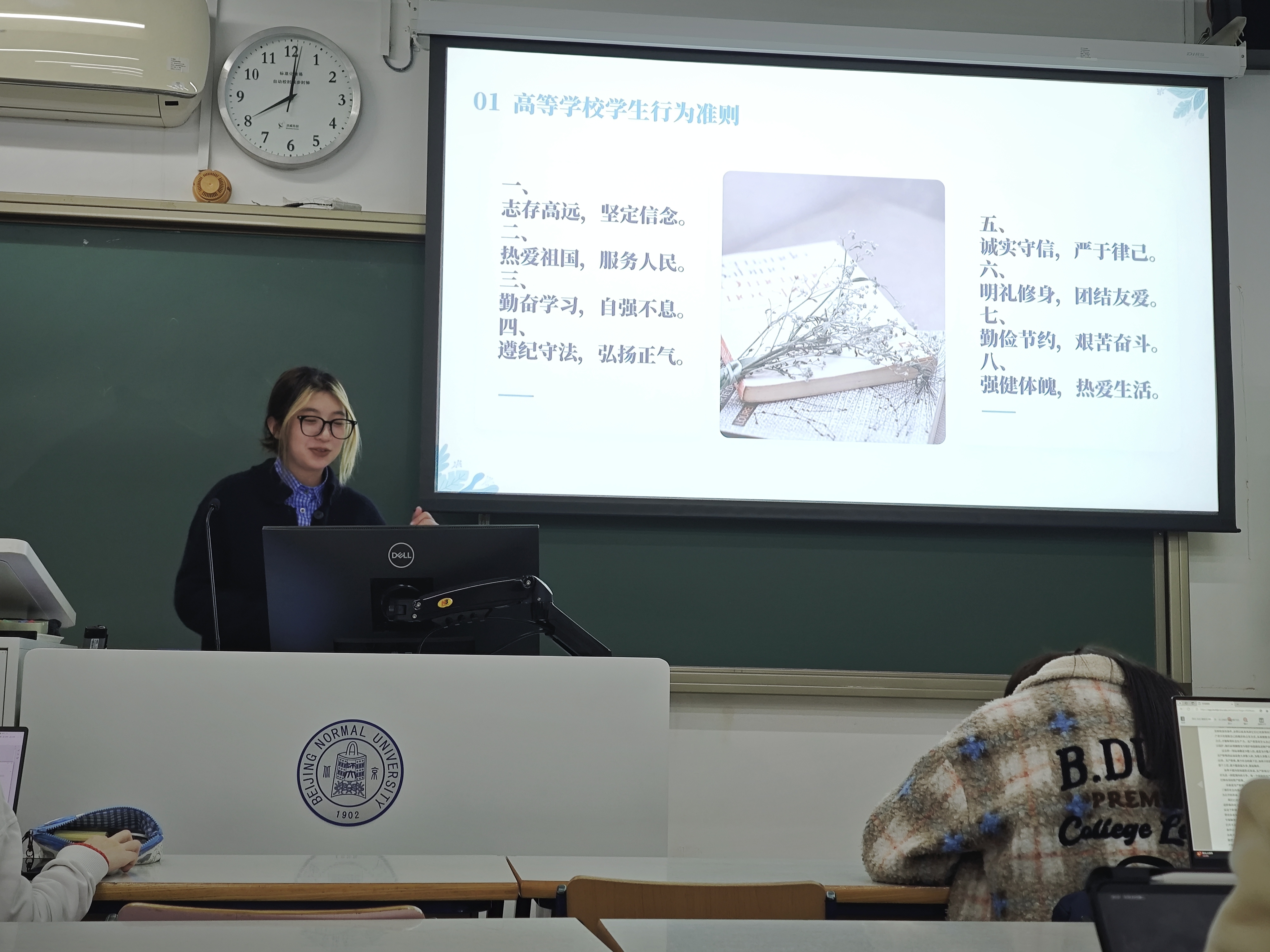 2024年10月29日晚20:00,污污漫画 2023级综合班于教二105教室举办10月主题班会。 本次班会的主题是“知规守纪,行稳致远”。班长向同学们介绍讲解了高等学校学生行为准则,强调身为高等学校学生需要知晓规则、严守纪律,对个人的社会生活和成长发展都十分重要。