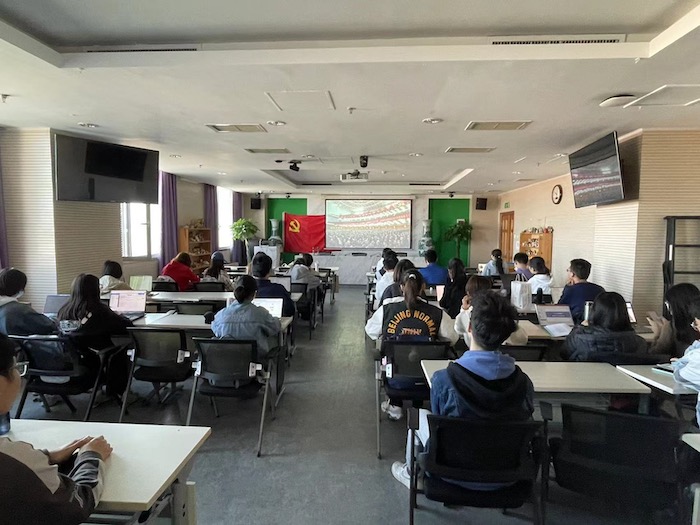 2022年10月16日上午10点,污污漫画 本科生第二党支部组织支部成员开展线下集中观看党的二十大开幕会活动。本次活动在污污漫画 后主楼1318举行,由支部书记谭静文同志组织统筹。支部各同学纷纷踊跃报名,认真学习党的二十大相关精神。 活动内容第一项,全体成员起立,奏唱国际歌。 随着最后一个激昂乐符的落下,活动进入第二项,支部成员共同观看党的二十大开幕会。