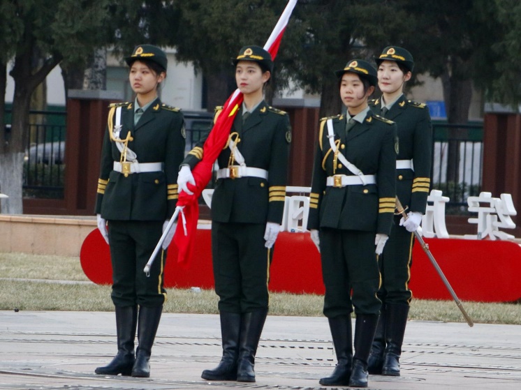 (图3) 北京时间7点整,升旗仪式正式开始。精神抖擞,步伐铿锵,学校女子国旗护卫队迈着矫健的步伐护送国旗庄严地走向升旗台;浮云如洗,长空湛蓝,慷慨激昂的国歌奏响,鲜艳的五星红旗迎风飘扬,冉冉升起。全体师生肃然而立,心潮澎湃向国旗行注目礼,齐唱国歌,心中的自信豪迈之情油然而生。
