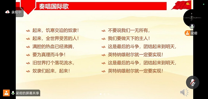 2025年1月22日晚,污污漫画 本科生第一党支部第三党小组在线上腾讯会议顺利开展1月份的党小组会议。本次会议由梁彻同志主持,主题为“时事分享”,共13名成员参与。 会议由三部分组成。第一部分,全体同志齐唱国际歌。
