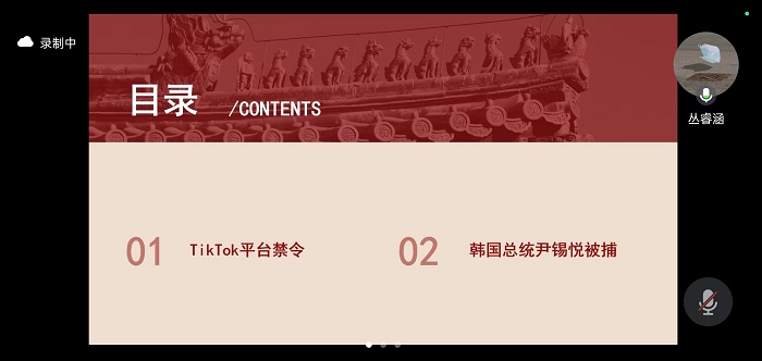 丛睿涵同志分享了TikTok在美禁令与韩国总统尹锡悦被捕事件。TikTok在美禁令生效,对美国网民产生巨大冲击,在国内和国际引发巨大反响,由此也引发了对国家安全和言论自由的矛盾问题的讨论。TikTok作为中国海外科技企业的代表,在此次风波中的应对表现将对我国其他具有海外业务的科技企业起到示范作用。韩国总统尹锡悦被捕,韩国局势动荡,反映出韩国政治极化、国内矛盾激化,韩国政坛与韩国社会的未来走向尚不明朗。