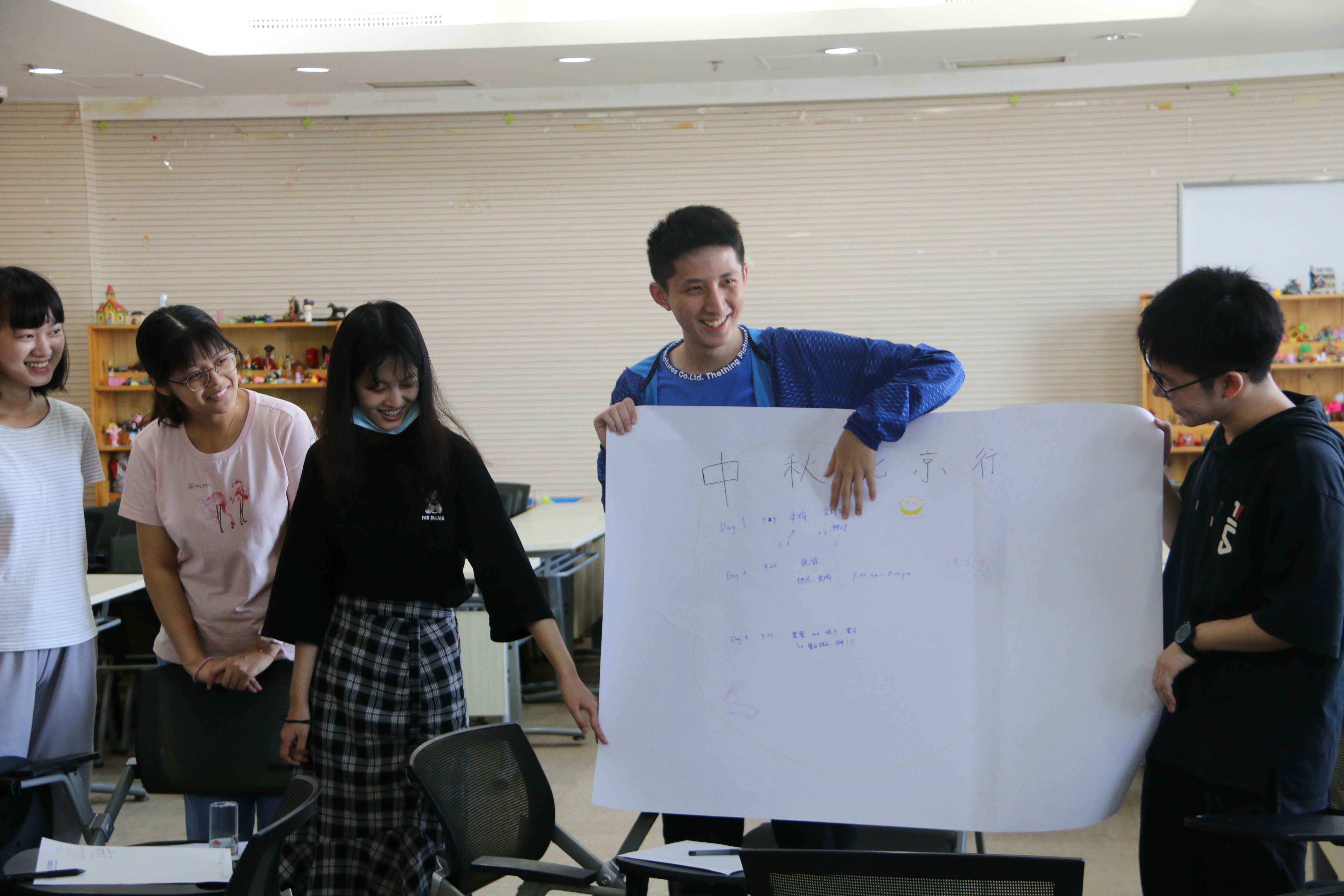 图7 同学在分享自己的自画像 之后,每个小组都要完成一个任务:合作完成一个中秋游玩计划,要求每个小组分工明确并用海报的形式呈现和展示。大家的合作成果有的考虑详尽、计划周密,有的天马行空,生动诱人。这也预示着未来的班级建设,每个人都有机会用自己的方式贡献智慧和力量。 图8 小组在创作海报 图9 小组在展示海报