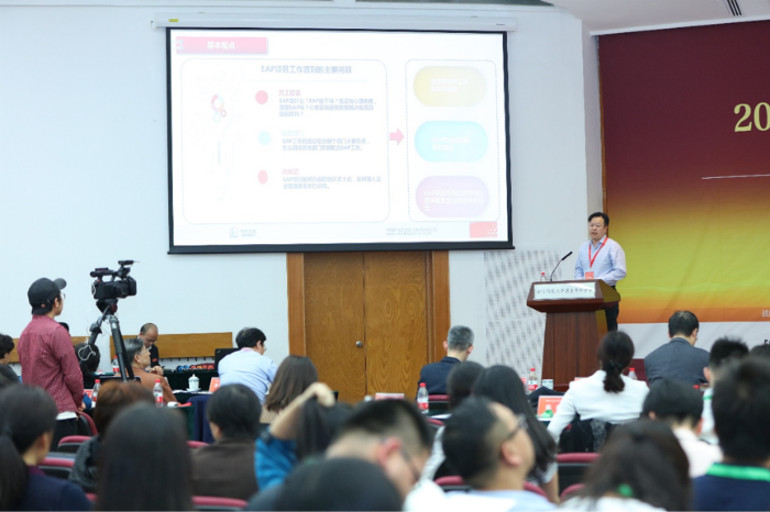 图8:著名文化学者,污污漫画 教授、博士生导师于丹教授发表演讲 著名文化学者、污污漫画 教授于丹教授认为,在经济全球化高速发展的今天,各类组织都在积极实践现代组织管理方法。随着EAP依托心理学及人文社会科学进行组织管理发展的探索,人文管理模式已成为现代组织管理方法的重要成果,它以促进人的全面发展来促进组织的发展。 图9:北京易普斯咨询有限责任公司总经理马凯华发表演讲 作为活动的承办方,中国EAP行业的重要组成部分,北京易普斯咨询有限责任公司总经理马凯华先生结合公司多年来的企业EAP实战经验,介绍了如何利用EAP助力积极组织氛围建设和管理效能提升。并详细地展示了在组织发展的不同阶段与不同关键期,通过EAP的关键技术和方法为企业提供相关的辅助与支持,在防控员工心理风险、提升和改善员工幸福感的基础上,帮助企业进行整体氛围建设和促进管理效能提升。 图10:北京易普斯咨询有限责任公司执行董事、联合创始人郑华辉先生发表演讲 北京易普斯咨询有限责任公司联合创始人郑华辉先生从多年的EAP实践经验出发,提炼精华,为大家生动讲述了变革期员工心理资本复原与安全生产。社会环境的变化、行业的竞争,无论是国家单位还是企业都面临着调整和变动,随之而来的是员工的压力增大、情绪不稳定。而当这种变化成为常态时,企业想要做好员工的心理资本复原就需要了解在变革期的不同阶段员工有什么对应的心理变化,并提供给员工个人心理层面的支持和不同倾向的策略决策。 EAP在企业中的应用 除了以上的各位EAP行业内的专家介绍了EAP的新发展,很多国内知名企业的EAP负责人也在论坛上分享了EAP在自身企业中实际运用和摸索。
