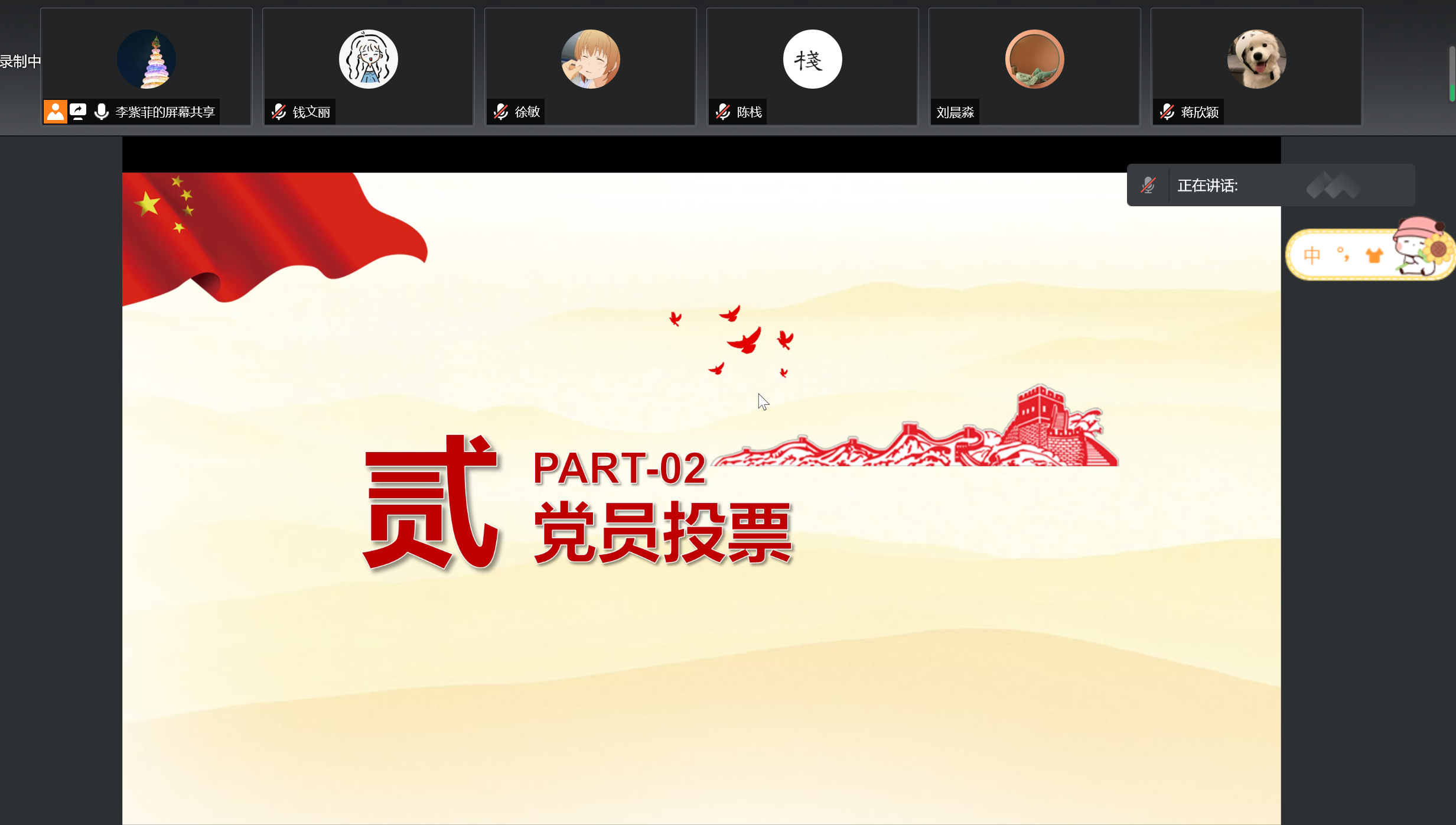 2021年9月30日下午,污污漫画 研究生第六党支部通过“腾讯会议”开展入党积极分子会。会议由党支部书记李紫菲主持召开,9名党员及10名积极分子同志积极参与。入党积极分子会主要针对提交入党申请书并经过团支部推优的陈栈同志、王子仪同志和郭梓楠同志是否确定为入党积极分子进行了表决。