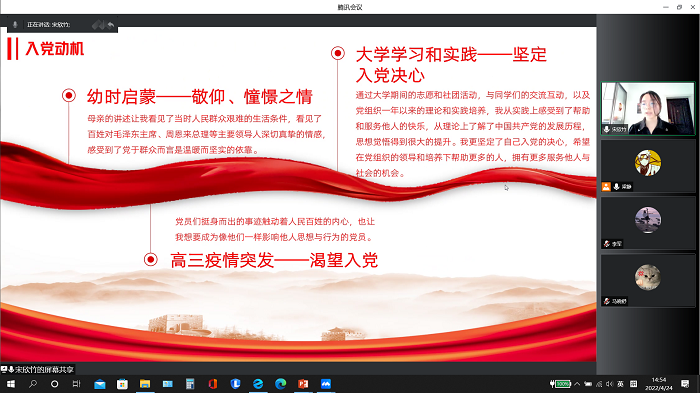 接着,丁格一、陆靖仪等10名入党积极分子便依次向我们展示了他们的预答辩内容,在四分钟之内依托PPT表达了自己的入党动机变化、介绍了自己以往的实践经历等。每人答辩过后,在场的党员和预备党员针对其简历、PPT、讲述内容等方面提出了PPT切换修改、精简段落、增加图片、改善排版等建议。