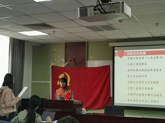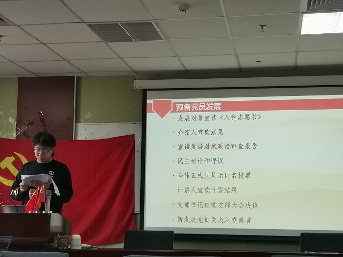 全体到场人员合唱《国际歌》后,主持人对本次大会的流程及发展对象顺序进行介绍。随后,邓祎祎和张宇衡2位同志分别宣读了入党志愿书,并由第一介绍人宣读介绍人意见。
