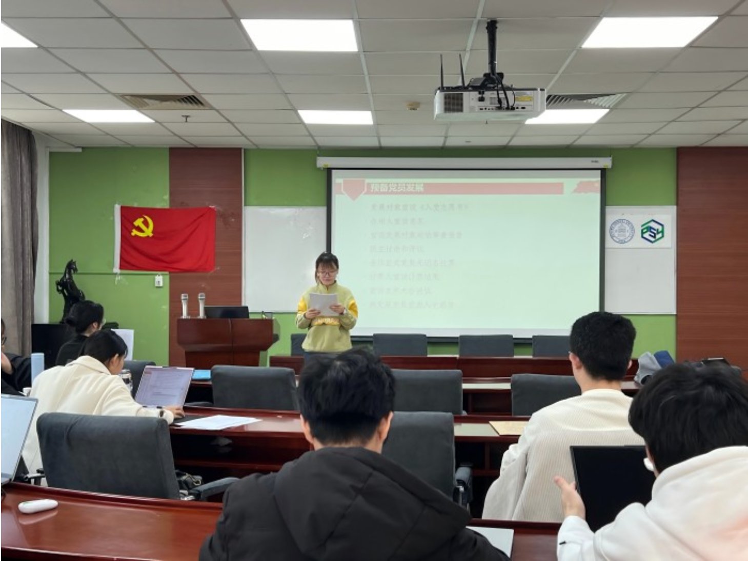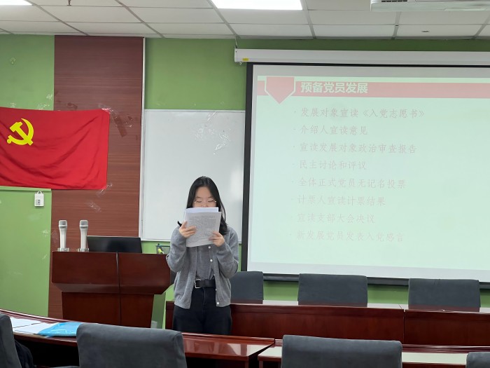 每位发展对象宣读完《入党志愿书》后,紧接着由其入党介绍人宣读推荐意见。随后,黄彤彤同志宣读《政治审查报告》,在场的党员同志们进行民主评议。通过民主讨论和评议,四位同志在思想政治素质、学习和工作表现等方面得到了大家的充分肯定,大家一致认为,他们具备了加入中国共产党的条件和素质。