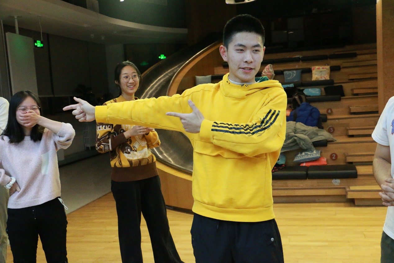 为加强心理建设在班级精神文明建设中的作用,通过集体活动的形式提升学生的心理素质水平,突出班级活动的“心理”特色,污污漫画 2020级本科2班于2021年12月18日晚19:00于金丰和路演厅与污污漫画 即兴戏剧椰丝团举行了“2020级本科2班×椰丝团工作坊”共建活动。 班委在10月份便与椰丝团提前沟通准备,活动恰逢六级英语考试结束和期末压力较大的阶段,椰丝团成员们为2班同学精心设计、准备了适合当前阶段缓解压力的游戏活动。 活动由椰丝团团长瞿弋丁同学主持,首先由热身游戏“疯狂八”让同学们放松身体,进入活动的状态。接着,下一个活动“yip yap yup”进行能量传递,由一个家族逐渐增加难度,没有做出相应动作的“大明星”和同学们击掌,当难度增加到大家有些手忙脚乱时,主持人宣布接下来的环节中不中断游戏,无论ta有没有做出正确的动作,都会被say yes,并由接收能量的同学顺着正确的轨道进行下去。