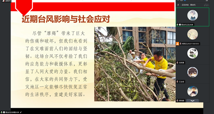 高诗月同志分享了“近期台风影响与社会应对”的时事。高诗月同志简单介绍了台风“摩羯”和“普拉桑”的基本信息,以图文的形式向大家展示了台风造成的严重的人员伤亡和财产损失。台风过后,受灾地区的恢复与重建工作成为重中之重,政府,救援机构以及社会各界积极行动。最后引出“灾难中的家国大爱让我们动容。这些事件对你有什么启示?”等问题,引起大家的思考。