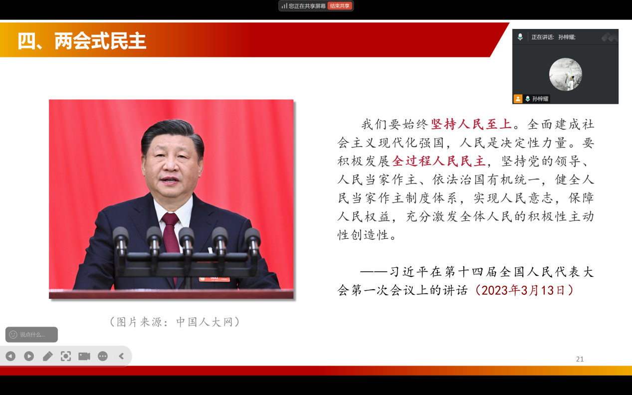 05 两会让我意识到,每一个人都是国家发展的参与者和贡献者,我深刻感受到全过程人民民主的强大生命力。民主并非一句空洞的口号,而是实实在在体现在每一个决策、每一项政策之中。人大代表和政协委员们来自各行各业,他们深入基层调研,倾听民众呼声,将人民的诉求原原本本地带到两会现场。这种从群众中来,到群众中去的民主实践,让人民真正成为国家的主人,也让我们对国家的发展充满信心。正如习近平总书记所强调的,人民民主是中国共产党始终高举的旗帜,两会就是这一旗帜最生动的展示。 ——2024级学术硕士第一党支部 丁一