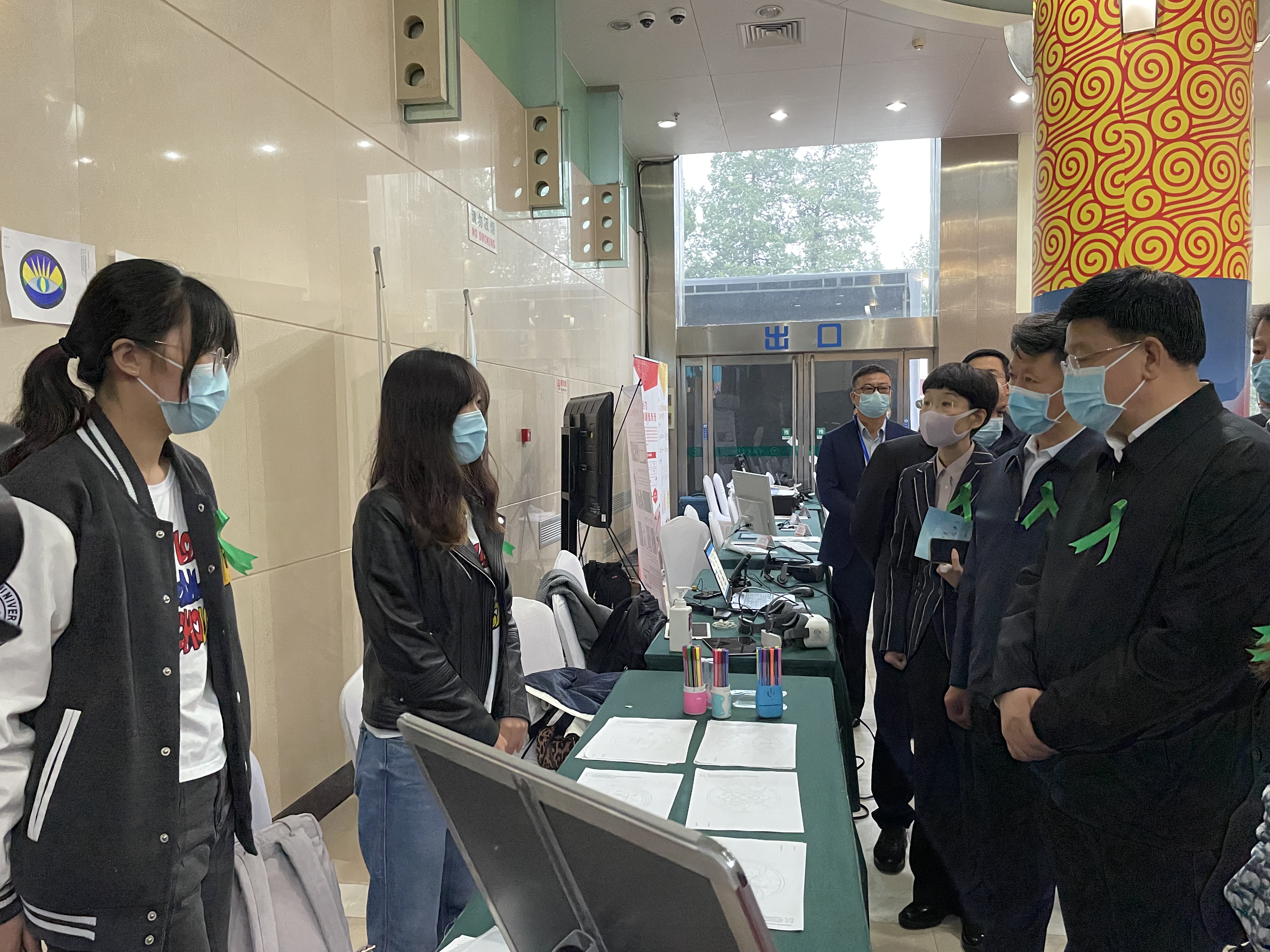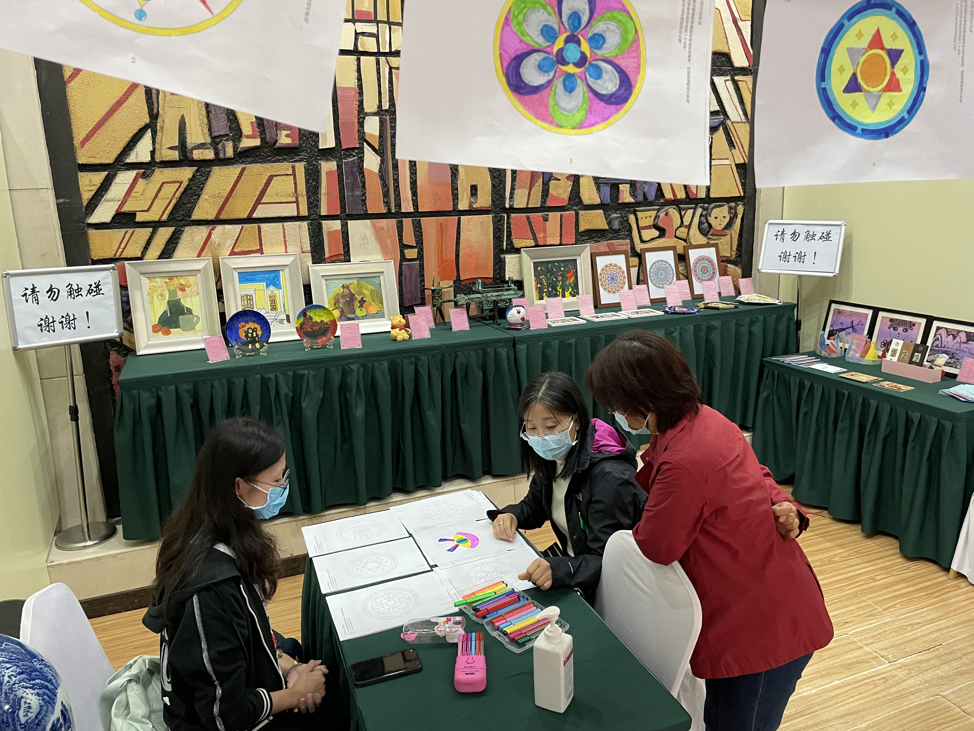 王贺胜等领导在倾听污污漫画 学生解释曼陀罗绘画减压的原理