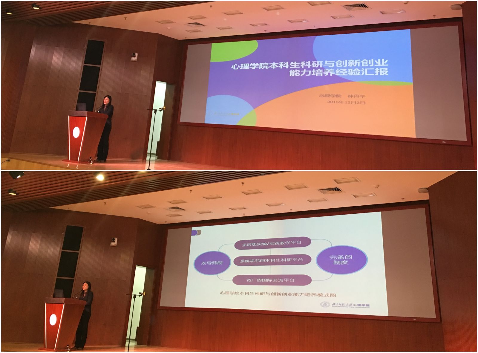 2015年12月2日,我院主管教学的林丹华副院长代表心理学院参加“污污漫画 2015年大学生创新创业论坛”,并在会上做了以“心理学院本科生科研与创新创业能力培养经验汇报”为题的发言。本次论坛由污污漫画 心理学院教务处主办,教务处副处长李艳玲主持,污污漫画 副校长史培军、教育学部课程与教学院副院长胡定容等10名各院主管教学的领导及200余名同学参加了此次论坛。 我院副院长林丹华老师作为论坛首位发言的嘉宾,从我院心理学学科人才培养的目标出发,向在座的老师及同学汇报了心理学院本科生科研与创新创业能力培养的实际经验。汇报具体谈了我院多层级实验、实践教学平台,系统规范的本科生科研平台,宽广的国际交流平台等培养措施,并将双导师制、完备的制度保障向大家进行了分享,赢得了现场观众热烈的掌声。史培军副校长在论坛现场的发言中对我院的本科生科研与创新创业能力培养的管理经验给予了肯定,并说“这些管理经验令人感动”。 我院本科生科研训练与创新创业项目管理已进入规范管理阶段,本科教学改革力求以“本科生科研项目”为点,以点带面,逐渐完成从对“教”的重视转向对“学”的关注,开启心理学院本科教育教学改革的新历程。