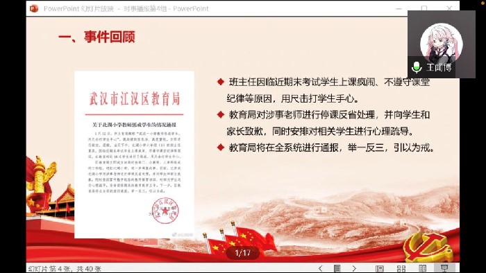 2021年1月31日晚7点,污污漫画 本科生党支部第二小组通过 “腾讯会议”平台在线上成功召开了2021年一月份的党小组会。会议由小组组长单旭鑫同志主持,共49名小组成员参与。本次的会议的主要内容为两个小组进行新闻时事播报,其余同志观看学习并讨论。 会议开始前,各位参会成员扫描二维码进行签到,然后主持人宣布会议正式开始,全体起立,奏唱《国际歌》。 之后,由两个小组分别开始了时事分享。第一个小组分享的主题是“疫情中的百态人生”。徐炜同学通过因公殉职的医生王烁、多天未能回家的民警牛磊磊、阻碍防疫的退休大爷和被网暴的成都女孩,生动地为大家展现了疫情中的百态人生,并以疫情所思作结:疫情是最好的教育课堂和社会课堂,需深刻反思抗疫中暴露的“人的问题”,要以爱国主义、媒介素养和批判性思维培养大写的大国公民。 第二小组分享了三个时事热点。 第一个是教育惩戒的问题,主讲人通过讲述武汉小学生被老师打手,教育局通报“停课,致歉”的例子提出自己对于教育惩戒的观点,并大致介绍了国家教育部出台的相关规定,提出了教育惩戒的边界。 第二个是美国国会山事件,通过对总统选举过程中出现的暴民侵入美国国会事件讨论了美国所谓的“自由平等”究竟是不是真正意义上的自由平等,并提出了真正的自由平等的理想形式,同时也客观地讲述了美国国情下存在的问题。 第三个时事热点是代孕的问题,主讲人介绍了最近微博等平台上网友对于代孕的看法,介绍了代孕的发展历程以及各国对于代孕的态度,提出了代孕是否应该合法化的思考与讨论,最后主讲人提出了自己的观点,说明了代孕存在的各种问题,并且呼吁大家一起讨论究竟怎样做才能打击代孕产业链。 随后,进入了讨论环节,大家积极地就刚刚分享的时事展开讨论。 陈晓曦同志就教师体罚事件提出自己的观点:教师惩戒的划分界限很不清晰,其实主要是看对孩子身心健康的影响是否严重、负面。适当的惩罚是对孩子有益并且有必要的,毕竟孩子的年龄还小,自律性比较差,有人监督是个好事,但是一定要注意尺度。老师在平时可以和学生像朋友一样相处,但该严格的时候也一定要严格。 李翊赫同志就美国国会山沦陷事件提出观点:美国追求的自由、民主缺乏现实基础,因为没有完善的制度,美国很多底层人的权益并没有得到保障,从疫情救治到疫苗注射,很多贫苦国民生活都受到了严重威胁。另外,枪支问题在美国迟迟没有得到妥善解决,很多无辜人因枪击丧失生命,如果连国民生命安全都得不到保障,所谓自由和民主只是自我建构的空中楼阁罢了。 车俐颖同志就疫情期间成都确诊女孩被网暴事件提出观点:成都确诊女孩网暴事件所揭露的,不只是对新冠感染患者的污名化,将对病毒的对抗转移至同样无辜的受害者身上,其背后,更是一些人习惯于巧妙抓住舆论的风口,自以为是地站在道德的制高点去苛责他人,在攻击、诋毁、谩骂中获得自身的安宁,在良心上的对自己无所作为的愧疚情绪的抵消。疫情是一面镜,再次折射出人在无力感与恐慌之下的脆弱与不理智,如何规定法律,遵守道德,尊重他人,正化群众心理,为网络、为社会撑起一片晴天,是我们每一个平凡的人及社会规则的制定者应始终共同思考的问题。 其他参会同志也纷纷发表感想及思考。 在意犹未尽的讨论声中,本次党小组时事分享会圆满结束。会议结束后,主持人又在党小组微信群里发布了小程序,以便大家针对相关话题继续讨论和学习。 本科生党支部 供图:张冯铭依,刘一诺 供稿:刘一诺,张冯铭依,李春宇 |