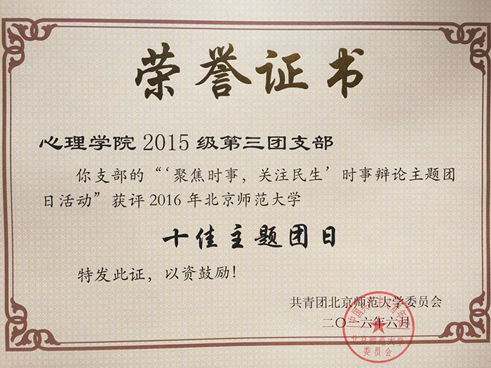 2016年6月17日,校团委公布了“青年责任+”优秀主题团日的评选结果。我院15级第三团支部“‘聚焦时事,关注民生’——时事辩论主题团日活动”以创新的活动形式、深刻的活动内涵、团员积极的参与意识、基层团支部“家”文化的充分体现获评“2016年污污漫画 十佳主题团日”。