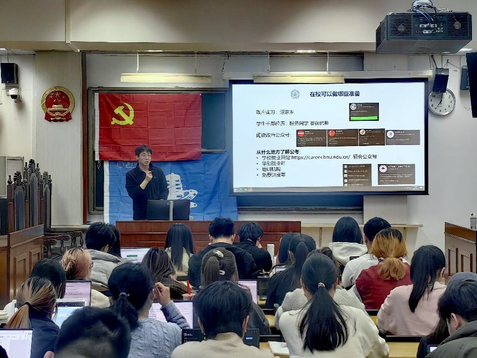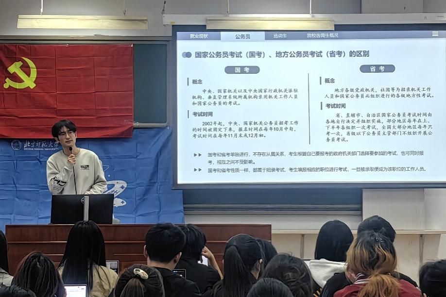 宣讲人连阳宇从国考、省考及选调生考试三大板块入手,系统梳理了岗位信息发布、报名资格审查、材料提交等关键环节的流程与时间线。他结合实际案例,分享了精准的政策解读、报考准备的信息来源,以及“星辰计划”系列特色活动,为同学们提供了权威、全面的信息渠道,助力全面了解公务员考试的基础知识,帮助大家把握报考良机。