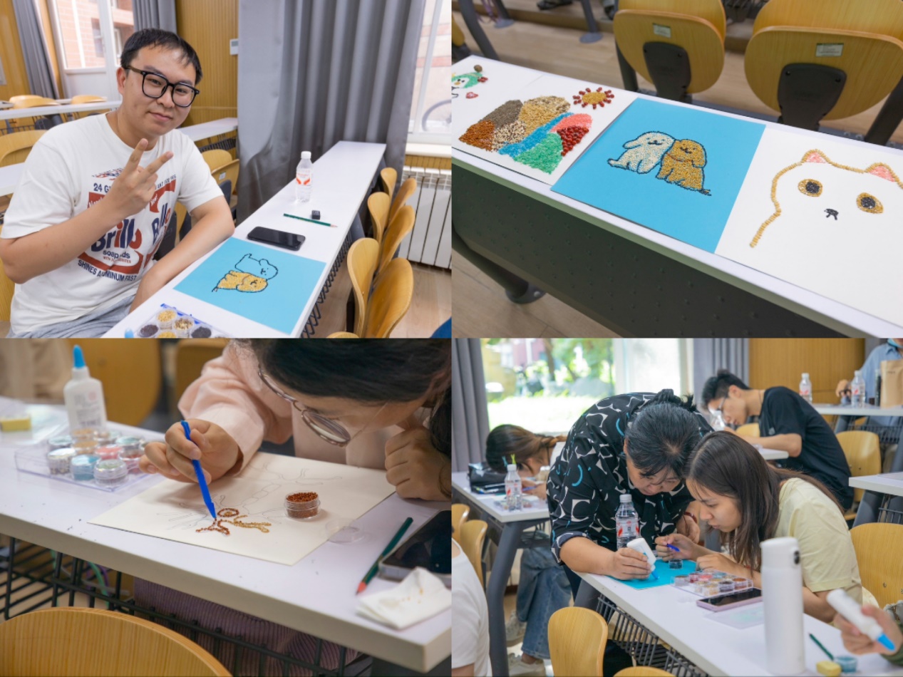 随后,孙群老师、实验教学中心秘书张文渊老师和学生志愿者们组织同学们进行了种艺画的创作。学部同学们学习并动手操作,完成了各类谷物种子为材料的艺术创作,亲身体验将农耕文明元素融入美育的魅力,产出了一系列精美的作品。
